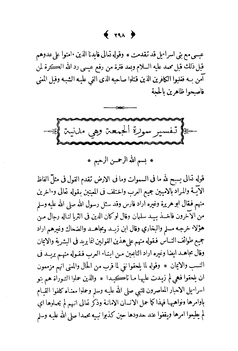 قوله تعالى يسبح لله ما في السموات وما في الأرص تقدم القول في مثل ألفاظ الآية والمراد بالأميين جميع العرب واختلف في المعينين بقول تعالى وآخرين منهم فقال أبو هريرة وغيره أراد فارس وقد سئل رسول الله ص - من الآخرون فأخذ بيد سلمان وقال لو كان الدين في الثريا لناله رجال من هؤلاء خرجه مسلم والبخاري وقال ابن زيد ومجاهد والضحاك وغيرهم أراد جميع طوائف الناس فقوله منهم على هذين القولين إنما يريد في البشرية والإيمان وقال مجاهد أيضا وغيره أراد التابعين من أبناء العرب فقوله منهم يريد في النسب والإيمان