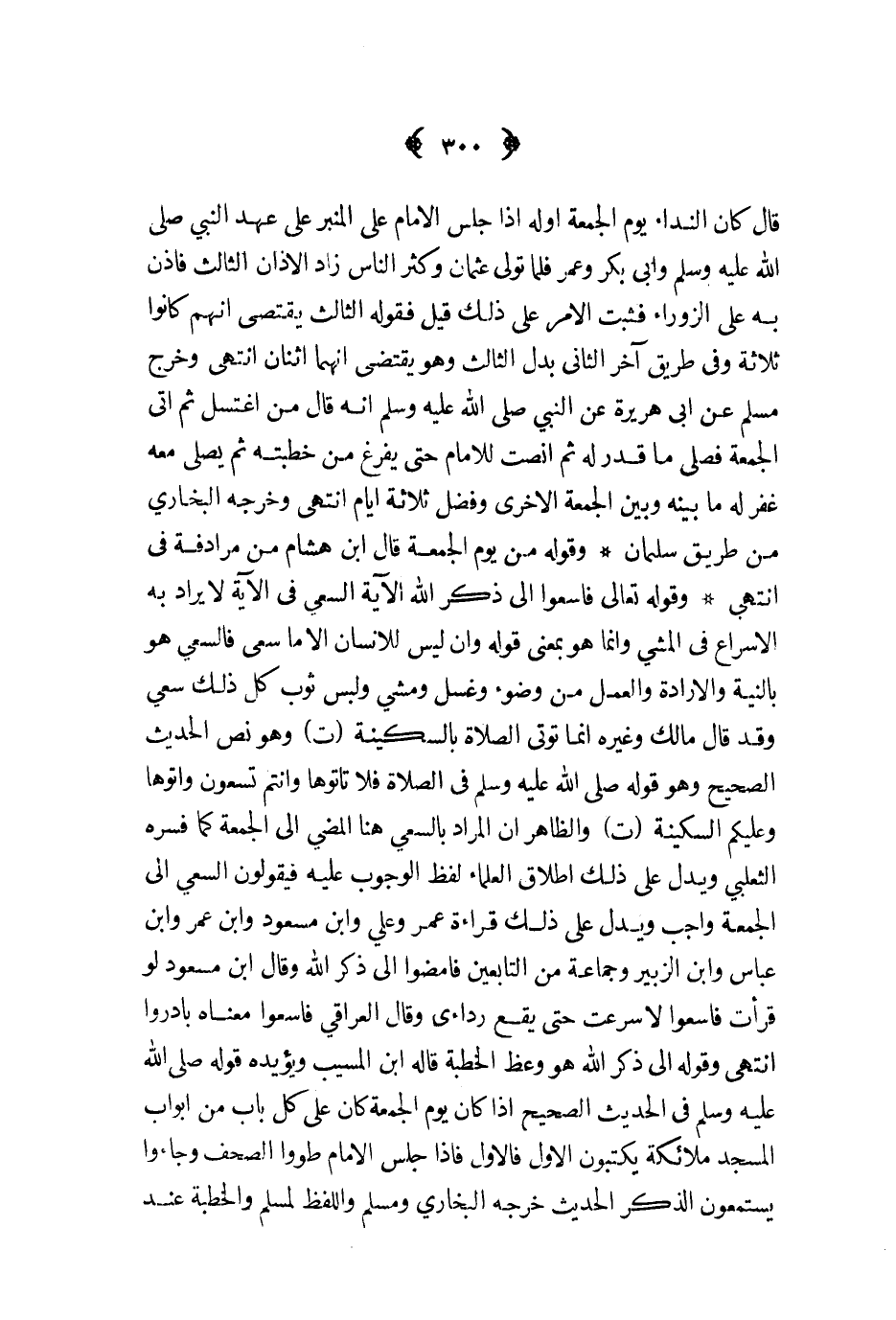 وقوله تعالى فاسعوا إلى ذكر الله الآية السعي في الآية لا يراد به الإسراع في المشي وإنما هو بمعنى قوله وأن ليس للإنسان إلا ما سعى فالسعي هو بالنية والإرادة والعمل من وضوء وغسل ومشي ولبس ثوب كل ذلك سعي وقد قال مالك وغيره إنما تؤتى الصلاة بالسكينة ت وهو نص الحديث الصحيح وهو قوله ص - في الصلاة فلا تأتوها وأنتم تسعون وأتوها وعليكم السكينة ت والظاهر أن المراد بالسعي هنا المضي إلى الجمعة كما فسره الثعلبي ويدل على ذلك إطلاق العلماء لفظ الوجوب عليه فيقولون السعي إلى الجمعة واجب ويدل على ذلك قراءة عمر وعلي وابن مسعود وابن عمر وابن عباس وابن الزبير وجماعة من التابعين فامضوا إلى ذكر الله وقال ابن مسعود لو قرأت فاسعوا لأسرعت حتى يقع ردائي وقال العراقي فاسعوا معناه بادروا انتهى وقوله إلى ذكر الله هو وعظ الخطبة قاله ابن المسيب ويؤيده قوله ص - في الحديث الصحيح إذا كان يوم الجمعة كان على كل باب من أبواب المسجد ملائكة يكتبون الأول فالأول فإذا جلس الإمام طووا الصحف وجاؤوا يستمعون الذكر الحديث خرجه البخاري ومسلم واللفظ لمسلم والخطبة عند