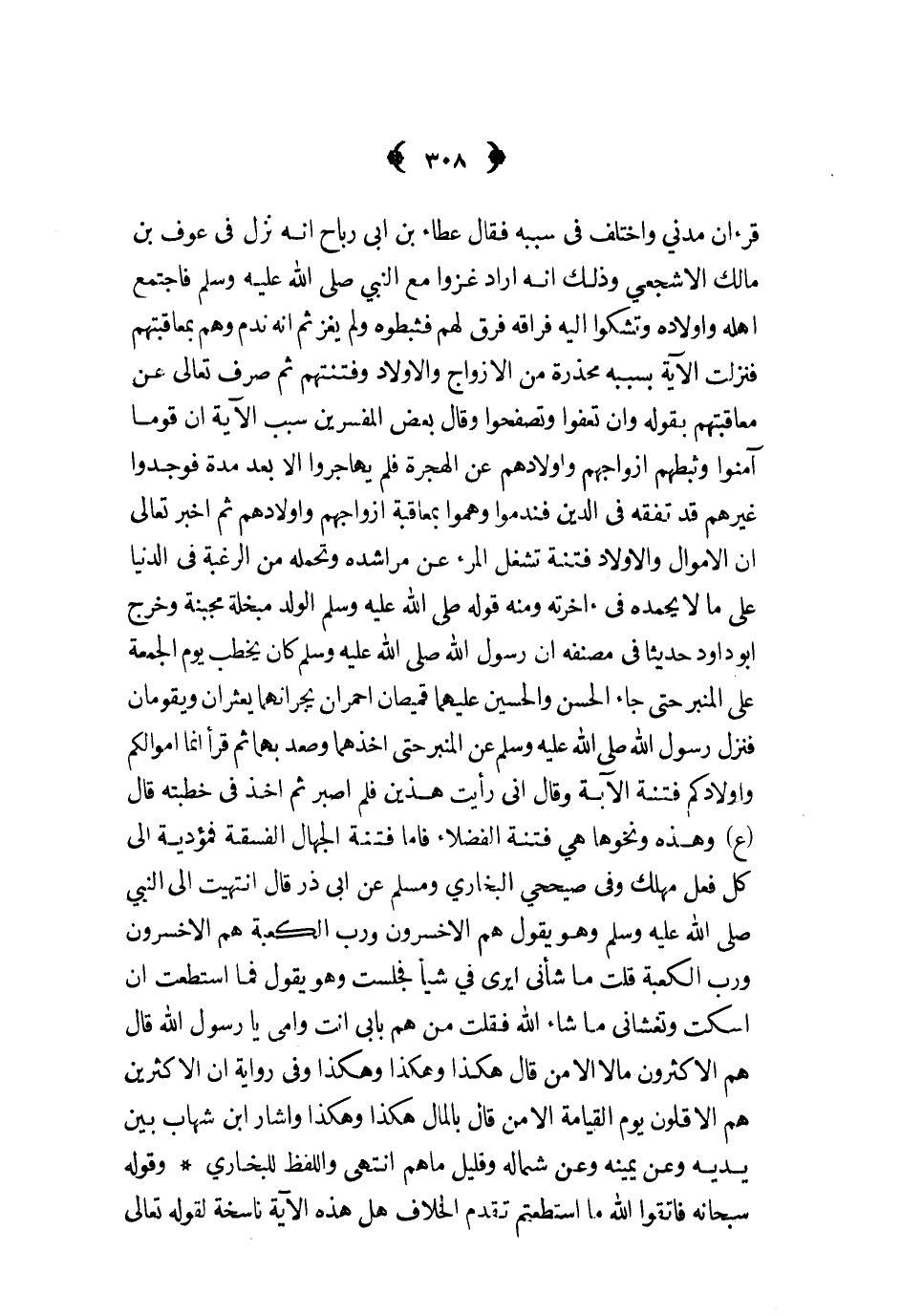 قرءان مدني واختلف في سببه فقال عطاء بن أبي رباح أنه نزل في عوف بن مالك الأشجعي وذكل أنه أراد غزوا مع النبي ص - فاجتمع أهله وأولاده وتشكوا إليه فراقه فرق لهم فثبطوه ولم يغز ثم إنه ندم وهم بمعاقبتهم فنزلت الآية بسببه محذرة من الأزواج والأولاد وفتنتهم ثم صرف تعالى عن معاقبتهم بقوله وإن تعفوا وتصفحوا وقال بعض المفسرين سبب الآية إن قوما آمنوا وثبطهم أزواجهم وأولادهم عن الهجرة فلم يهاجروا إلا بعد مدة فوجدوا غيرهم قد تفقه في الدين فندموا وهموا بمعاقبة أزواجهم وأولادهم ثم أخبر تعالى أن الأموال والأولاد فتنة تشغل المرء عن مراشده وتحمله من الرغبة في الدنيا على ما لا يحمده في آخرته ومنه قوله ص - الولد مبخلة مجينة وخرج أبو داود حديثا في مصنفه أن رسول الله ص - كان يخطب يوم الجمعة على المنبر حتى جاء الحسن والحسين عليهما قميصان أحمران يجرانهما يعثران ويقومان فنزل رسول الله ص - عن المنبر حتى أخذهما وصعد بهما ثم قرأ إنما أموالكم وأولادكم فتنة الآية وقال أني رأيت هذين فلم أصبر ثم أخذ في خطبته قال ع وهذه ونحوها هي فتنة الفضلاء فأما فتنة الجهال الفسقة فمؤدية إلى كل فعل مهلك وفي صحيحي البخاري ومسلم عن أبي ذر قال انتهيت إلى النبي ص - وهو يقول هم الأخسرون ورب الكعبة هم الأخسرون ورب الكعبة قلت ما شأني أيرى في شيئا فجلست وهو يقول فما استطعت أن أسكت وتغشاني ما شاء الله فقلت من هم بأبي أنت وأمي يا رسول الله قال هم الأكثرون مالا إلا من قال هكذا وهكذا وهكذا وفي رواية أن الأكثرين هم الأقلون يوم القيامة إلا من قال بالمال هكذا وهكذا وأشار ابن شهاب بين يديه وعن يمينه وعن شماله وقليل ما هم انتهى واللفظ للبخاري