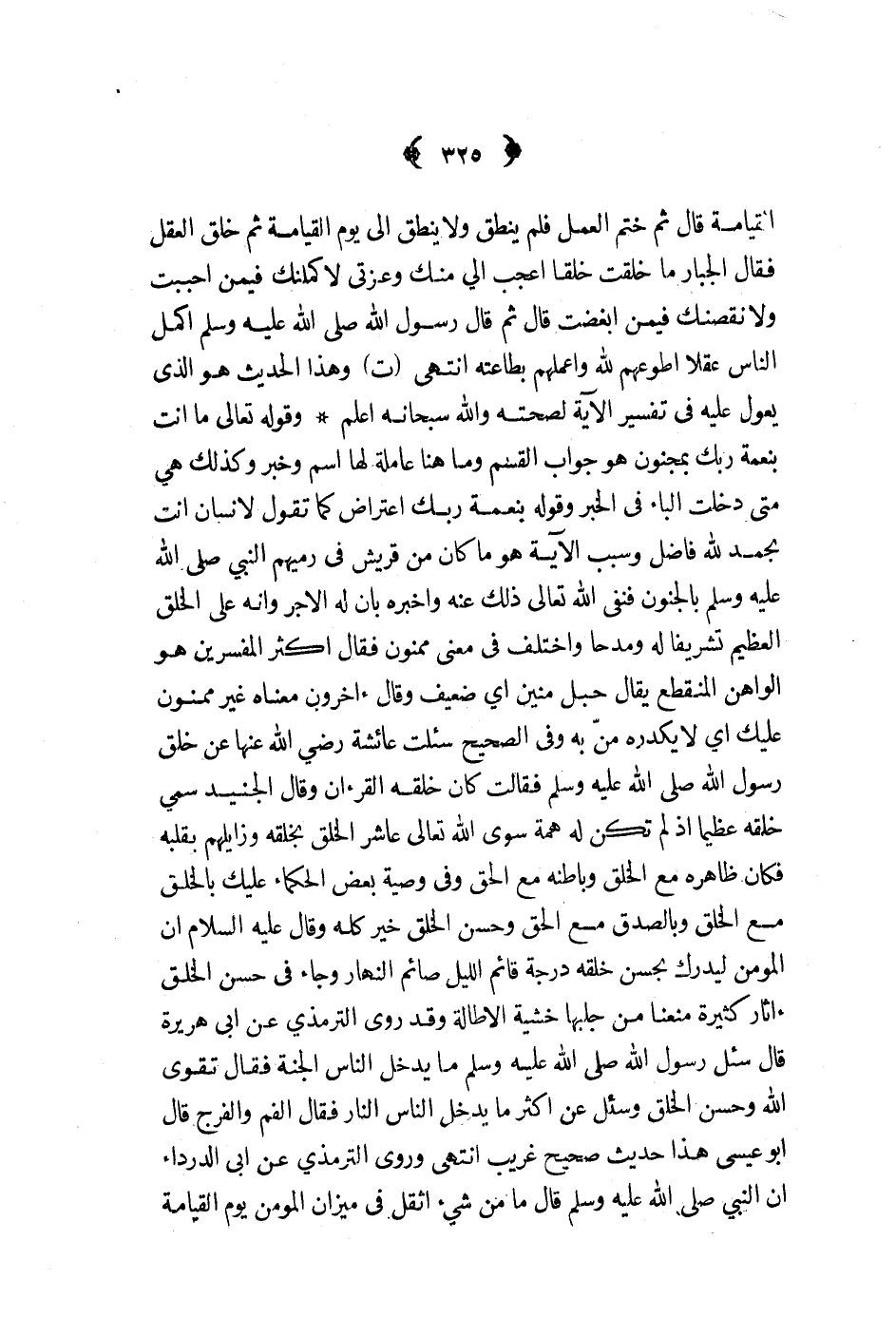 وقوله تعالى ما أنت بنعمة ربك بمجنون وهو جواب القسم وما هنا عاملة لها اسم وخبر وكذلك هي متى دخلت الباء في الخبر وقوله بنعمة ربك اعتراض كما تقول لإنسان أنت بحمد لله فاضل وسبب الآية هو ما كان من قريش في رميهم النبي ص - بالجنون فنفى الله تعالى ذلك عنه وأخبره بأن له الأجر وأنه على الخلق العظيم تشريفا له ومدحا واختلف في معنى ممنون فقال أكثر المفسرين هو الواهن المنقطع يقال حبل منين أي ضعيف وقال آخرون معناه غير ممنون عليك أي لا يكدره من به وفي الصحيح سئلت عائشة رضي الله عنها عن خلق رسول الله ص - فقالت كان خلقه القرآن وقال الجنيد سمي خلقه عظيما إذ لم تكن له همة سوى الله تعالى عاشر الخلق بخلقه وزايلهم بقلبه فكان ظاهره مع الخلق وباطنه مع الحق وفي وصية بعض الحكماء عليك بالخلق مع الخلق وبالصدق مع الحق وحسن الخلق خير كله وقال عليه السلام إن المؤمن ليدرك بحسن خلقه درجة قائم الليل صائم النهار وجاء في حسن الخلق آثار كثيرة منعنا من جلبها خشية الإطالة وقد روى الترمذي عن أبي هريرة قال سئل رسول الله ص - ما يدخل الناس الجنة فقال تقوى الله وحسن الخلق وسئل عن أكثر ما يدخل الناس النار فقال الفم والفرج قال أبو عيسى هذا حديث صحيح غريب انتهى وروى الترمذي عن أبي الدرداء أن النبي ص - قال ما من شيء أثقل في ميزان المؤمن يوم القيامة