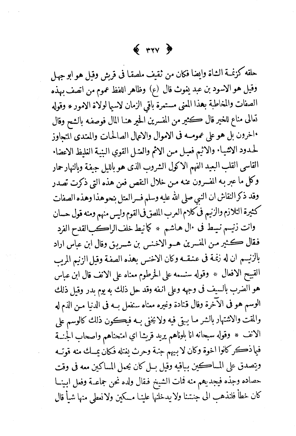 وقوله تعالى مناع للخير قال كثير من المفسرين الخير هنا المال فوصفه بالشح وقال آخرون بل هو على عمومه في الأموال والأعمال الصالحات والمعتدى المتجاوز لحدود الأشياء والإثم فعيل من الإثم والعتل القوي البنية الغليظ الأعضاء القاسي القلب البعيد الفهم الأكول الشروب الذي هو بالليل جيفة وبالنهار حمار وكل ما عبر به المفسرون عنه من خلال النقص فعن هذه التي ذكرت تصدر وقد ذكر النقاش أن النبي ص - فسر العتل بنحو هذا وهذه الصفات كثيرة التلازم والزنيم في كلام العرب الملصق في القوم وليس منهم ومنه قول حسان