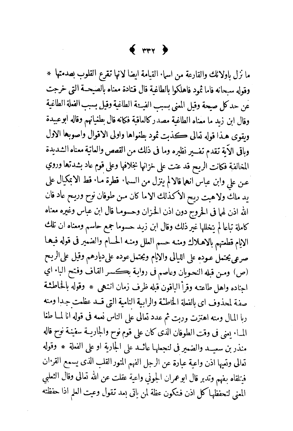 وقوله سبحانه فأما ثمود فأهلكوا بالطاغية قال قتادة معناه بالصيحة التي خرجت عن حد كل صيحة وقيل المعنى بسبب الفيئة الطاغية وقيل بسبب الفعلة الطاغية وقال ابن زيد ما معناه الطاغية مصدر كالعاقبة فكأنه قال بطغيانهم وقال أبو عبيدة ويقوي هذا قوله تعالى كذبت ثمود بطغوها وأولى الأقوال وأصوبها الأول وباقي الآية تقدم تفسير نظيره وما في ذلك من القصص والعاتية معناه الشديدة المخالفة فكانت الريح قد عتت على خزانها بخلافها وعلى قوم عاد بشدتها وروي عن علي وابن عباس أنهما قالا لم ينزل من السماء قطرة ماء قط إلا بمكيال على يد ملك ولا هبت ريح إلا كذلك إلا ما كان من طوفان نوح وريح عاد فإن الله أذن لهما في الخروج دون إذن الخزان وحسوما قال ابن عباس وغيره معناه كاملة تباعا لم يتخللها غير ذلك وقال ابن زيد حسوما جمع حاسم ومعناه أن تلك الأيام قطعتهم بالإهلاك ومنهم حسم العلل ومنه الحسام والضمير في قوله فيها صرعى يحتمل عوده على الليالي والأيام ويحتمل عوده على ديارهم وقيل على الريح ص ومن قبله النحويان وعاصم في رواية بكسر القاف وفتح الباء أي أجناده وأهل طاعته وقرأ الباقون قبله ظرف زمان انتهى