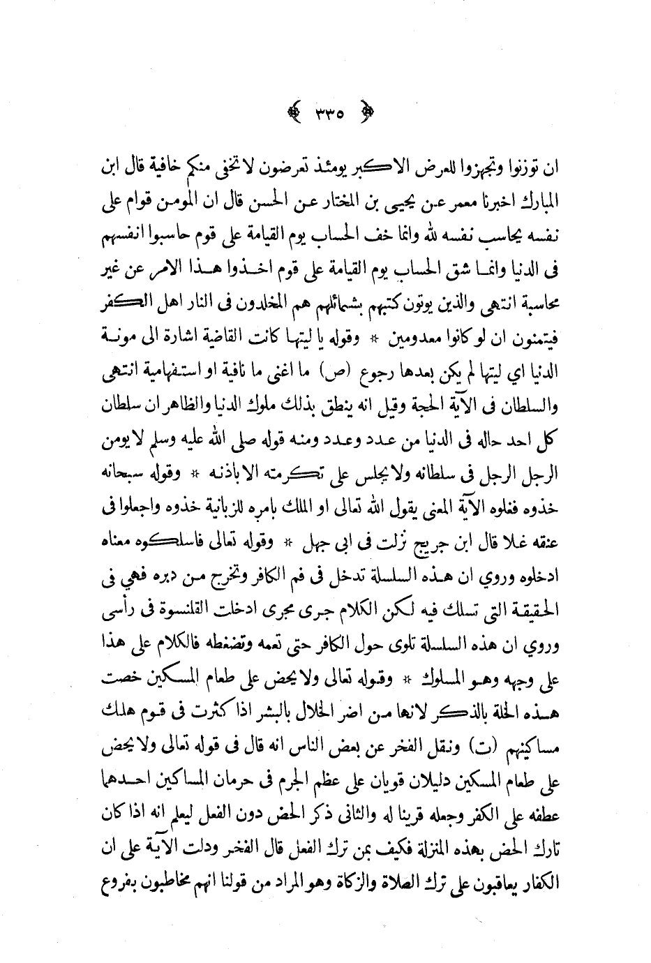 وقوله تعالى ولا يحض على طعام المسكين خصت هذه الخلة بالذكر لانها من اضر الخلال بالبشر اذا كثرت في قوم هلك مساكينهم ت ونقل الفخر عن بعض الناس أنه قال في قوله تعالى ولا يحض على طعام المسكين دليلان قويان على عظم الجرم في حرمان المساكين احدهما عطفه على الكفر وجعله قرينا له والثانى ذكر الحض دون الفعل ليعلم انه اذا كان تارك الحض بهذه المنزلة فكيف بمن ترك الفعل قال الفخر ودلت الآية على ان الكفار يعاقبون على ترك الصلاة والزكاة وهو المراد من قولنا انهم مخاطبون بفروع