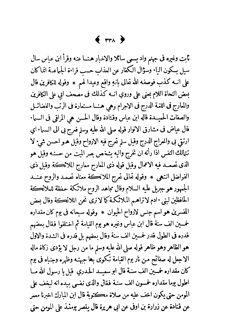 وقوله سبحانه في يوم كان مقداره خمسين الف سنة قال ابن عباس وغيره هو يوم القيامة ثم اختلفوا فقال بعضهم قدره في الطول قدر خمسين الف سنة وقال بعضهم بل قدرة في الشدة والاول هو الظاهر وهو ظاهر قوله ص - ما من رجل لا يؤدي زكاة ماله الا جعل له صفائح من نار يوم القيامة تكوى بها جبهته وظهره وجنباه في يوم كان مقداره خمسين الف سنة قال ابو سعيدالخدري قيل يا رسول الله ما اطول يوما مقداره خمسون الف سنة فقال والذي نفسي بيده انه ليخف على المومن حتى يكون اخف عليه من صلاة مكتوبة قال ابن المبارك اخبرنا معمر عن قتادة عن زرارة بن او في عن ابي هريرة قال يقصر يؤمئذ على المؤمن حتى