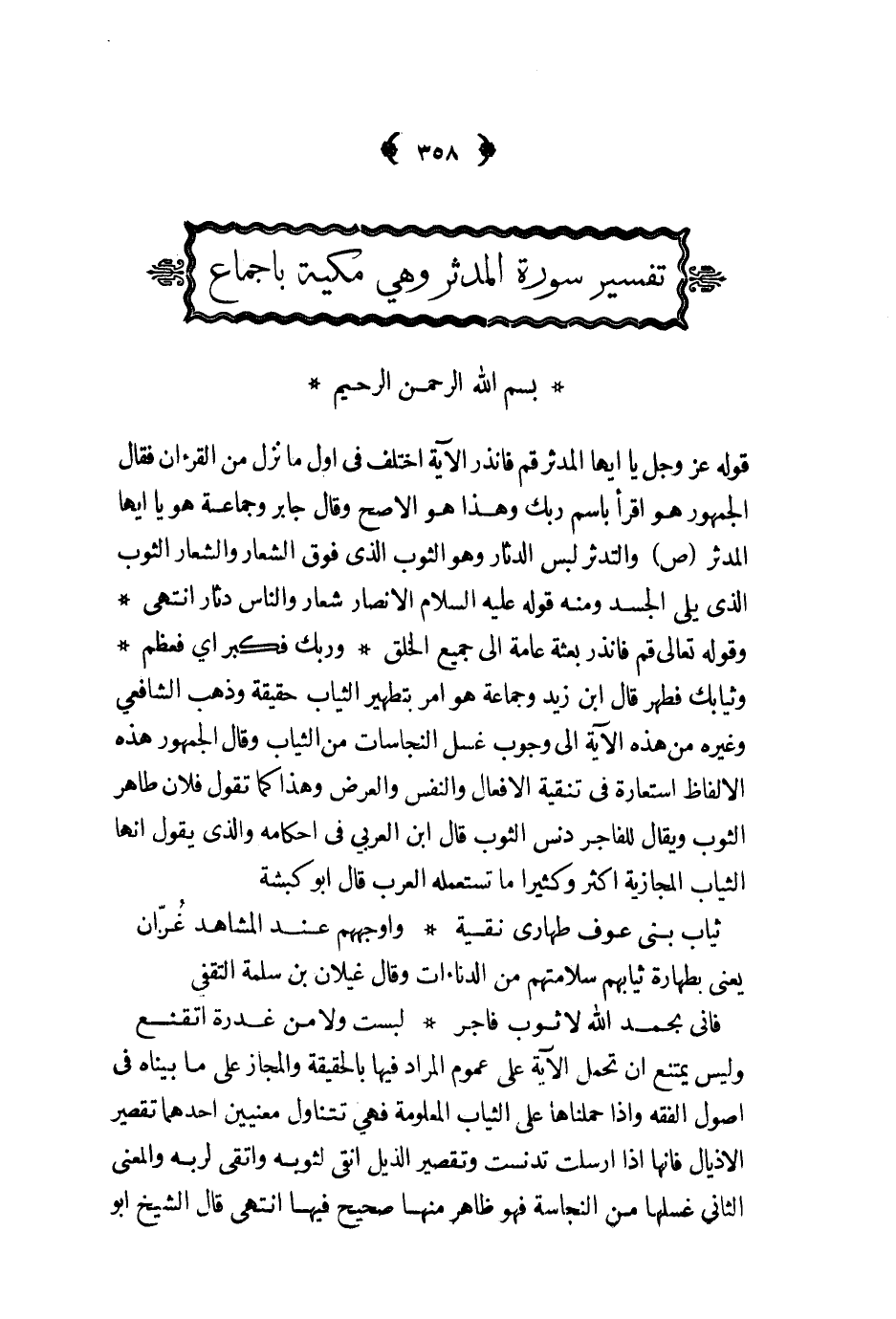 وربك فكبر اي فعظم وثيابك فطهر قال ابن زيد وجماعة هو امر بتطهير الثياب حقيقة وذهب الشافعي وغيره من هذه الآية الى وجوب غسل النجاسات من الثياب وقال الجمهور هذه الالفاظ استعارة في تنقية الافعال والنفس والعرض وهذا كما تقول فلان طاهر الثوب ويقال للفاجر دنس الثوب قال ابن العربي في احكامه والذي يقول انها الثياب المجازية اكثر كثيرا ما تستعمله العرب قال ابو كبشة ... ثياب بنى عوف طهارى نقية ... وأوجههم عند المشاهد غران ...