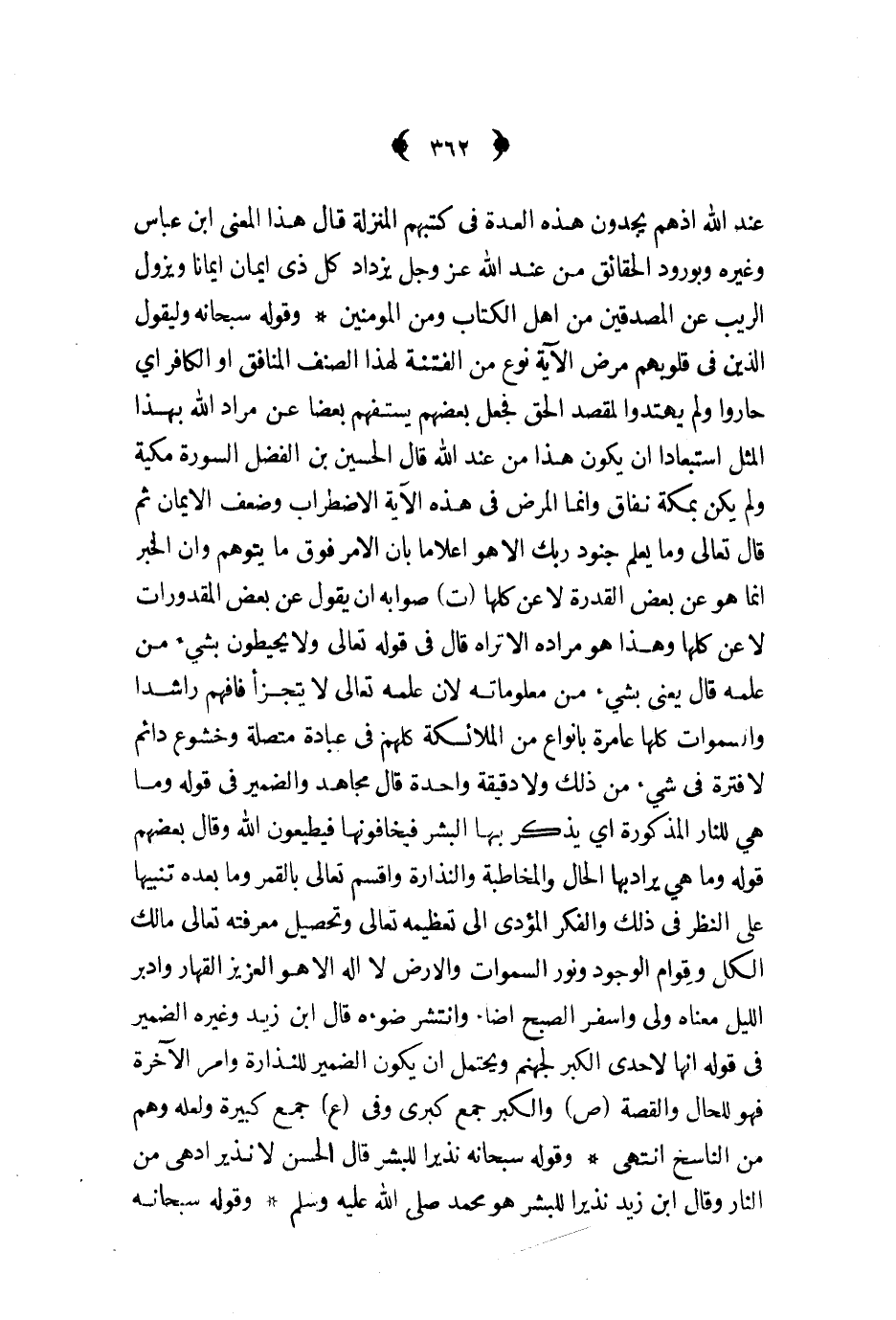 وقوله سبحانه وليقول الذين في قلوبهم مرض الآية نوع من الفتنة لهذا الصنف المنافق او الكافر اي حاروا ولم يهتدوا لمقصد الحق فجعل بعضهم يستفهم بعضا عن مراد الله بهذا المثل استبعادا ان يكون هذا من عند الله قال الحسين بن الفضل السورة مكية ولم يكن بمكة نفاق وانما المرض في هذه الآية الاضطراب وضعف الايمان ثم قال تعالى وما يعلم جنود ربك الا هو اعلاما بان الامر فوق ما يتوهم وان الخبر انما هو عن بعض القدرة لا عن كلها ت صوابه ان يقول عن بعض المقدورات لا عن كلها وهذا هو مراده الا تراه قال في قوله تعالى ولا يحيطون بشيء من علمه قال يعنى بشيء من معلوماته لان علمه تعالى لا يتجزأ فافهم راشدا والسموات كلها عامرة بانواع من الملائكة كلهم في عبادة متصلة وخشوع دائم لا فترة في شيء من ذلك ولا دقيقة واحدة قال مجاهد والضمير في قوله وما هي للنار المذكورة اي يذكر بها البشر فيخافونها فيطيعون الله وقال بعضهم قوله وما هي يراد بها الحال والمخاطبة والنذارة وأقسم تعالى بالقمر وما بعده تنبيها على النظر في ذلك والفكر المؤدي الى تعظيمه تعالى وتحصيل معرفته تعالى مالك الكل وقوام الوجود ونور السموات والارض لا اله الا هو العزيز القهار وادبر الليل معناه ولى واسفر الصبح اضاء وانتشر ضوءه قال ابن زيد وغيره الضمير في قوله انها لإحدى الكبر لجهنم ويحتمل ان يكون الضمير للنذارة وامر الآخرة فهو للحال والقصة ص والكبر جمع كبرى وفي ع جمع كبيرة ولعله وهم من الناسخ انتهى