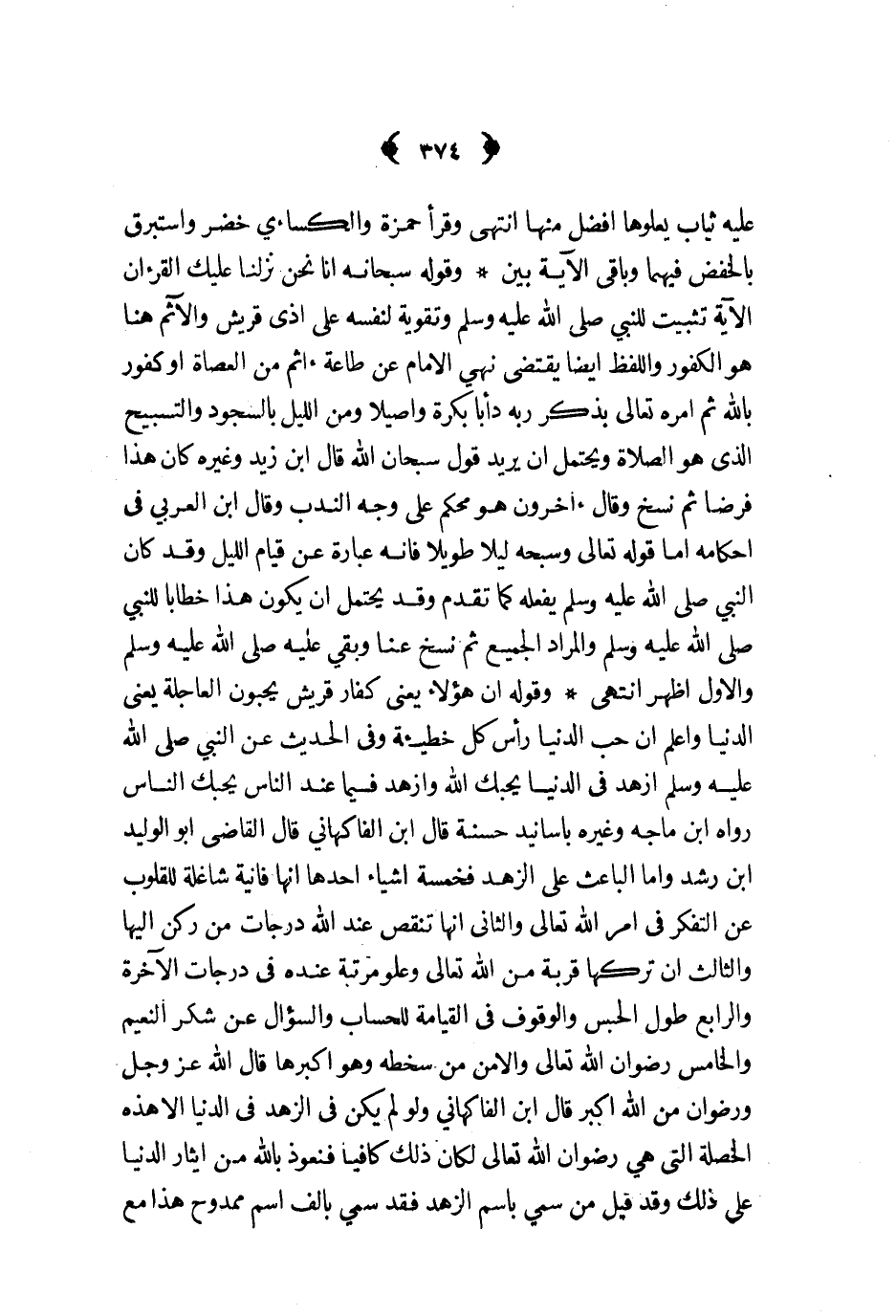 وقوله سبحانه انا نحن نزلنا عليك القرءان الآية تثبيت للنبي ص - وتقوية لنفسه على اذى قريش والآثم هنا هو الكفور واللفظ ايضا يقتضي نهي الامام عن طاعة ءاثم من العصاة او كفور بالله ثم امره تعالى بذكر ربه دأبا بكرة واصيلا ومن الليل بالسجود والتسبيح الذي هو الصلاة ويحتمل ان يريد قول سبحان الله قال ابن زيد وغيره كان هذا فرضا ثم نسخ وقال ءاخرون هو محكم على وجه الندب وقال ابن العربي في احكامه اما قوله تعالى وسبحه ليلا طويلا فانه عبارة عن قيام الليل وقد كان النبي ص - يفعله كما تقدم وقد يحتمل ان يكون هذا خطابا للنبي ص - والمراد الجميع ثم نسخ عنا وبقي عليه ص - والاول اظهر انتهى