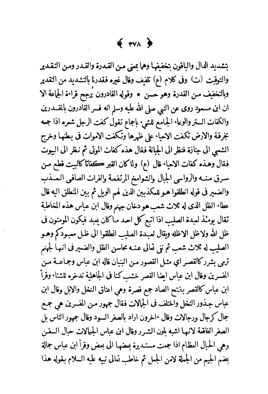 وقوله القادرون يرجح قراءة الجماعة الا ان ابن مسعود روى عن النبي ص - انه فسر القادرون بالمقدرين والكفات الستر والوعاء الجامع للشيء باجماع تقول كفت الرجل شعره اذا جمعه بخرقة والارض تكفت الاحياء على ظهرها وتكفت الاموات في بطنها وخرج الشعبي الى جنازة فنظر الى الجبانة فقال هذه كفات الموتى ثم نظر الى البيوت فقال وهذه كفات الاحياء قال ع ولما كان القبر كفاتا كالبيت قطع من سرق منه والرواسى الجبال والشوامخ المرتفعة والفرات الصافي العذب والضمير في قوله انطلقوا هو للمكذبين الذين لهم الويل ثم بين المنطلق اليه قال عطاء الظل الذي له ثلاث شعب وهو دخان جهنم وقال ابن عباس هذه المخاطبة تقال يومئذ لعبدة الصليب اذا اتبع كل احد ما كان يعبد فيكون المؤمنون في ظل الله ولا ظل الا ظله ويقال لعبدة الصليب انطلقوا الى ظل معبودكم وهو الصليب له ثلاث شعب ثم نفى تعالى عنه محاسن الظل والضمير في انها لجهنم ترمى بشرر كالقصر اي مثل القصور من البنيان قاله ابن عباس وجماعة من المفسرين وقال ابن عباس ايضا القصر خشب كنا في الجاهلية ندخره للشتاء وقرأ ابن عباس كالقصر بفتح الصاد جمع قصرة وهي اعناق النخل والابل وقال ابن عباس جذور النخل واختلف في الجمالات فقال جمهور من المفسرين هي جمع جمال كرجال ورجالات وقال ءاخرون اراد بالصفر السود وقال جمهور الناس بل الصفر الفاقعة لانها اشبه بلون الشرر وقال ابن عباس الجمالات حبال السفن وهي الحبال العظام اذا جمعت مستديرة بعضها الى بعض وقرأ ابن عباس جمالة بضم الجيم من الجملة لا من الجمل ثم خاطب تعالى نبيه عليه السلام بقوله هذا