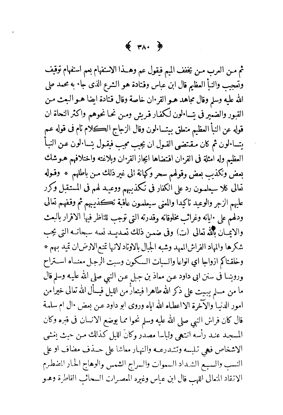ثم من العرب من يخفف الميم فيقول عم وهذا الاستفهام بعم استفهام توقيف وتعجيب والنبأ العظيم قال ابن عباس وقتادة هو الشرع الذي جاء به محمد ص - وقال مجاهد هو القرءان خاصة وقال قتادة ايضا هو البعث من القبور والضمير في يتساءلون لكفار قريش ومن نحا نحوهم واكثر النحاة ان قوله عن النبأ العظيم متعلق يتساءلون وقال الزجاج الكلام تام في قوله عم يتساءلون ثم كان مقتضى القول ان يجيب مجيب فيقول يتساءلون عن النبأ العظيم وله امثلة في القرءان اقتضاها ايجاز القرءان وبلاغته واختلافهم هو شك بعض وتكذيب بعض وقولهم سحر وكهانة الى غير ذلك من باطلهم