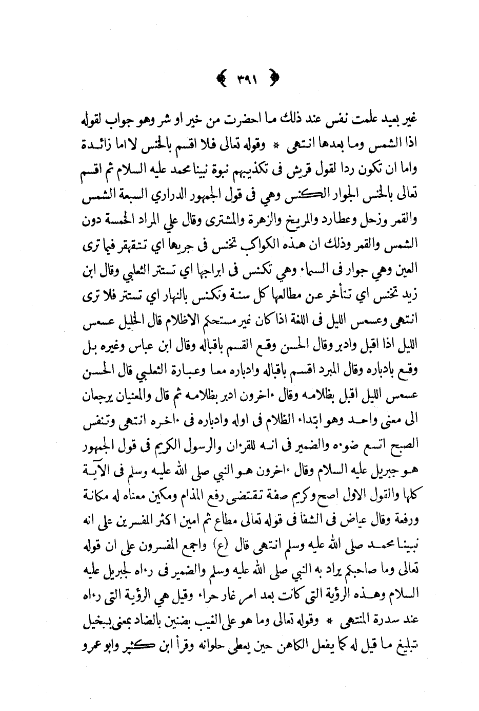 وقوله تعالى فلا اقسم بالخنس لا اما زائدة واما ان تكون ردا لقول قريش في تكذيبهم نبوة نبينا محمد عليه السلام ثم اقسم تعالى بالخنس الجوار الكنس وهي في قول الجمهور الدراري السبعة الشمس والقمر وزحل وعطارد والمريخ والزهرة والمشترى وقال علي المراد الخمسة دون الشمس والقمر وذلك ان هذه الكواكب تخنس في جريها اي تتقهقر فيما ترى العين وهي جوار في السماء وهي تكنس في ابراجها اي تستتر الثعلبي وقال ابن زيد تخنس اي تتأخر عن مطالعها كل سنة وتكنس بالنهار اي تستتر فلا ترى انتهى وعسعس الليل في اللغة اذا كان غير مستحكم الا ظلام قال الخليل عسعس الليل اذا اقبل وادبر وقال الحسن وقع القسم باقباله وقال وابن عباس وغيره بل وقع بادباره وقال المبرد اقسم باقباله وادباره معا وعبارة الثعلبي قال الحسن عسعس الليل اقبل بظلامه وقال ءاخرون ادبر بظلامه ثم قال والمعنيان يرجعان الى معنى واحد وهو ابتداء الظلام في اوله وادباره في ءاخره انتهى وتنفس الصبح اتسع ضوءه والضمير في انه للقرءان والرسول الكريم في قول الجمهور هو جبريل عليه السلام وقال ءاخرون هو النبي ص - في الآية كلها والقول الاول اصح وكريم صفة تقتضى رفع المذام ومكين معناه له مكانة ورفعة وقال عياض في الشفا في قوله تعالى مطاع ثم امين اكثر المفسرين على انه نبينا محمد ص - انتهى قال ع واجمع المفسرون على ان قوله تعالى وما صاحبكم يراد به النبي ص - والضمير في رءاه لجبريل عليه السلام وهذه الرؤية التي كانت بعد امر غار حراء وقيل هي الرؤية التي رءاه عند سدرة المنتهى