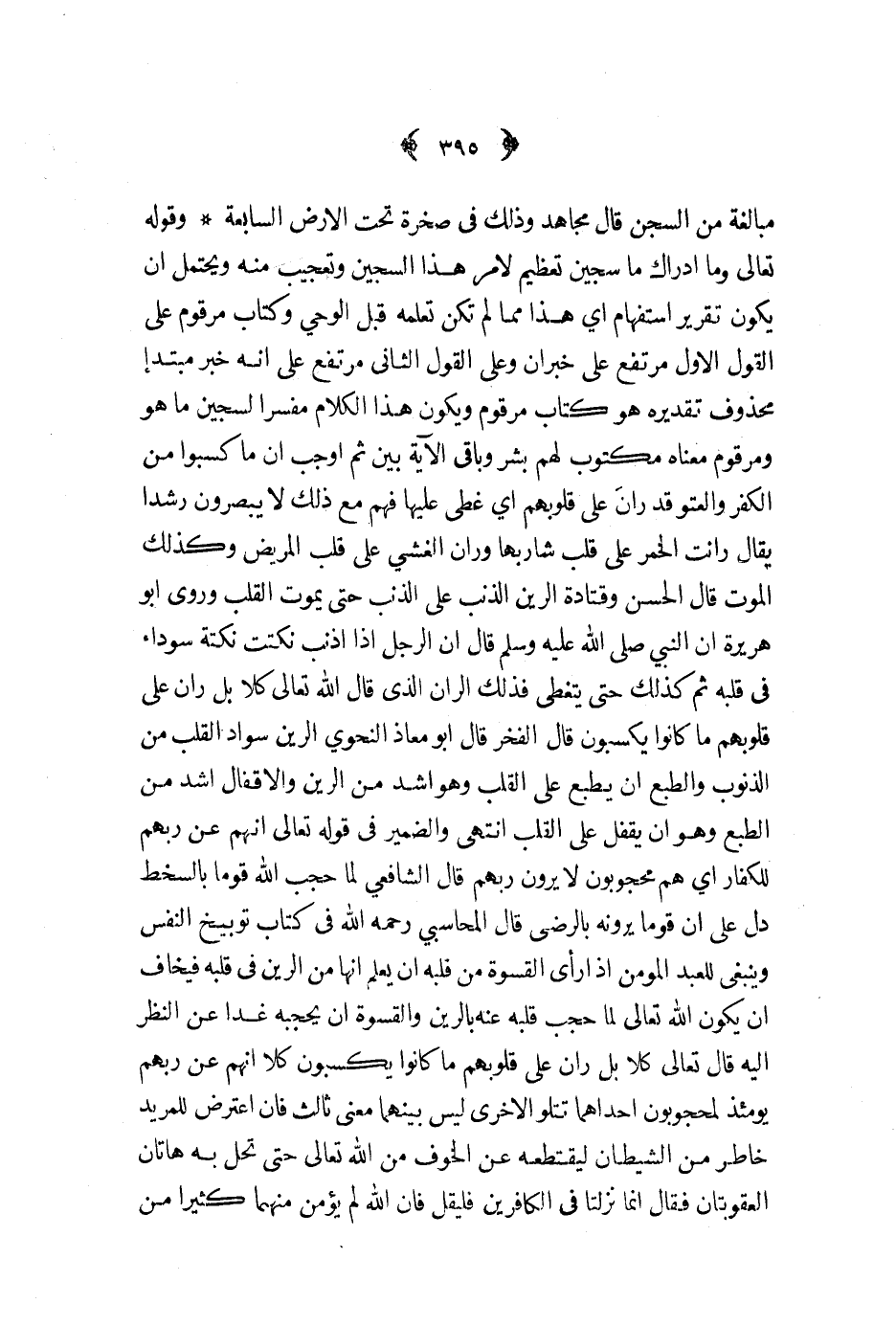 وقوله تعالى وما ادراك ما سجين تعظيم لامر هذا السجين وتعجيب منه ويحتمل ان يكون تقرير استفهام اي هذا مما لم تكن تعلمه قبل الوحي وكتاب مرقوم على القول الاول مرتفع على خبر ان وعلى القول الثاني مرتفع على انه خبر مبتدأ محذوف تقديره هو كتاب مرقوم ويكون هذا الكلام مفسرا لسجين ما هو ومرقوم معناه مكتوب لهم بشر وباقي الآية بين ثم اوجب ان ما كسبوا من الكفر والعتو قد ران على قلوبهم اي غطى عليها فهم مع ذلك لا يبصرون رشدا يقال رانت الخمر على قلب شاربها وران الغشي على قلب المريض وكذلك الموت قال الحسن وقتادة الرين الذنب على الذنب حتى يموت القلب وروى ابو هريرة ان النبي ص - قال ان الرجل اذا اذنب نكتت نكتة سوداء في قلبه ثم كذلك حتى يتغطى فذلك الران الذي قال الله تعالى كلا بل ران على قلوبهم ما كانوا يكسبون قال الفخر قال ابو معاذ النحوي الرين سواد القلب من الذنوب والطبع ان يطبع على القلب وهو اشد من الرين والاقفال اشد من الطبع وهو ان يقفل على القلب انتهى والضمير في قوله تعالى انهم عن ربهم للكفار اي هم محجوبون لا يرون ربهم قال الشافعي لما حجب الله قوما بالسخط دل على ان قوما يرونه بالرضى قال المحاسبي رحمه الله في كتاب توبيخ النفس وينبغي للعبد المؤمن اذا رأي القسوة من قلبه ان يعلم انها من الرين في قلبه فيخاف ان يكون الله تعالى لما حجب قلبه عنه بالرين والقسوة ان يحجبه غدا عن النظر اليه قال تعالى كلا بل ران على قلوبهم ما كانوا يكسبون كلا انهم عن ربهم يومئذ لمحجوبون احداهما تتلو الاخرى ليس بينهما معنى ثالث فان اعترض للمريد خاطر من الشيطان ليقتطعه عن الخوف من الله تعالى حتى تحل به هاتان العقوبتان فقال انما نزلتا في الكافرين فليقل فان الله لم يؤمن منهما كثيرا من