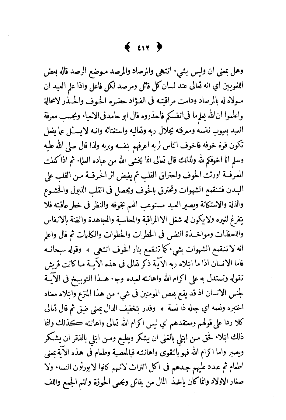 وهل بمعنى ان وليس بشيء انتهى والمرصاد والمرصد موضع الرصد قاله بعض اللغويين اي انه تعالى عند لسان كل قائل ومرصد لكل فاعل واذا علم العبد ان مولاه له بالمرصاد ودامت مراقبته في الفؤاد حضره الخوف والحذر لا محالة واعلموا ان الله يعلم ما في انفسكم فاحذروه قال ابو حامد في الاحياء وبحسب معرفة العبد بعيوب نفسه ومعرفته بجلال ربه وتعاليه واستغنائه وانه لا يسئل عما يفعل تكون قوة خوفه فاخوف الناس لربه اعرفهم بنفسه وبربه ولذا قال ص - انا اخوفكم لله ولذلك قال تعالى انما يخشى الله من عباده العلماء ثم اذا كملت المعرفة اورثت الخوف واحتراق القلب ثم يفيض اثر الحرقة من القلب على البدن فتنقمع الشهوات وتحترق بالخوف ويحصل في القلب الذبول والخشوع والذلة والاستكانة ويصير العبد مستوعب الهم بخوفه والنظر في خطر عاقبته فلا يتفرغ لغيره ولا يكون له شغل الا المراقبة والمحاسبة والمجاهدة والضنة بالانفاس واللحظات ومواخذة النفس في الخطرات والخطوات والكلمات ثم قال واعلم انه لا تنقمع الشهوات بشيء كما تنقمع بنار الخوف انتهى