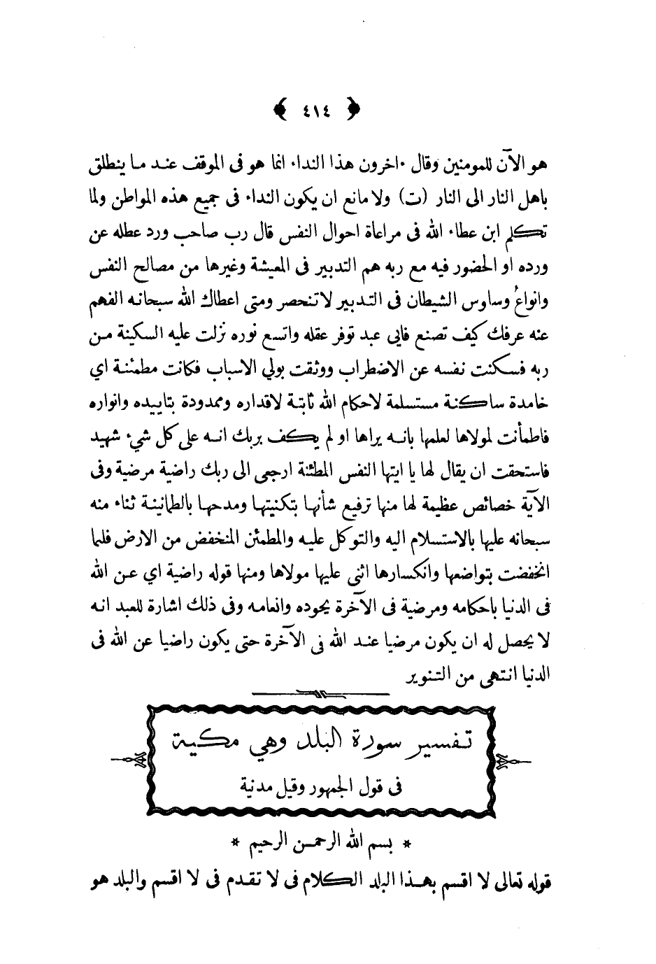 هو الآن للمؤمنين وقال ءاخرون هذا النداء انما هو في الموقف عند ما ينطلق بأهل النار الى النار ت ولا مانع ان يكون النداء في جميع هذه المواطن ولما تكلم ابن عطاء الله في مراعاة احوال النفس قال رب صاحب ورد عطله عن ورده او الحضور فيه مع ربه هم التدبير في المعيشة وغيرها من مصالح النفس وانواع وساوس الشيطان في التدبير لا تنحصر ومتى اعطاك الله سبحانه الفهم عنه عرفك كيف تصنع فأي عبد توفر عقله واتسع نوره نزلت عليه السكينة من ربه فسكنت نفسه عن الاضطراب ووثقت بولي الاسباب فكانت مطمئنة اي خامدة ساكنة مستسلمة لاحكام الله ثابتة لا قداره وممدودة بتاييده وانواره فاطمأنت لمولاها لعلمها بانه يراها او لم يكف بربك انه على كل شيء شهيد فاستحقت ان يقال لها يا ايتها النفس المطئنة ارجعي الى ربك راضية مرضية وفي الآية خصائص عظيمة لها منها ترفيع شأنها بتكنيتها ومدحها بالطمانينة ثناء منه سبحانه عليها بالإستسلام اليه والتوكل عليه والمطمئن المنخفض من الارض فلما انخفضت بتواضعها وانكسارها اثنى عليها مولاها ومنها قوله راضية اي عن الله في الدنيا باحكامه ومرضية في الآخرة يحوده وانعامه وفي ذلك اشارة للعبد انه لا يحصل له ان يكون مرضيا عند الله في الآخرة حتى يكون راضيا عن الله في الدنيا انتهى من التنوير