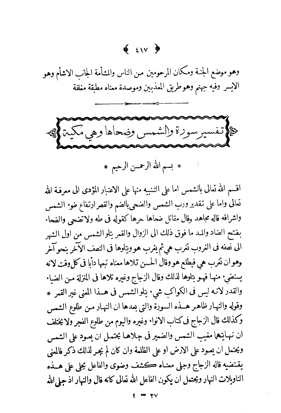 وقوله والنهار ظاهر هذه السورة والتي بعدها ان النهار من طلوع الشمس وكذلك قال الزجاج في كتاب الانواءوغيره واليوم من طلوع الفجر ولا يختلف ان نهايتهما مغيب الشمس والضمير في جلاها يحتمل ان يعود على الشمس ويحتمل ان يعود على الارض او على الظلمة وان كان لم يجر لذلك ذكر فالمعنى يقتضيه قاله الزجاج وجلى معناه كشف وضوى والفاعل بجلى على هذه التاويلات النهار ويحتمل ان يكون الفاعل الله تعالى كانه قال والنهار اذ جلى الله