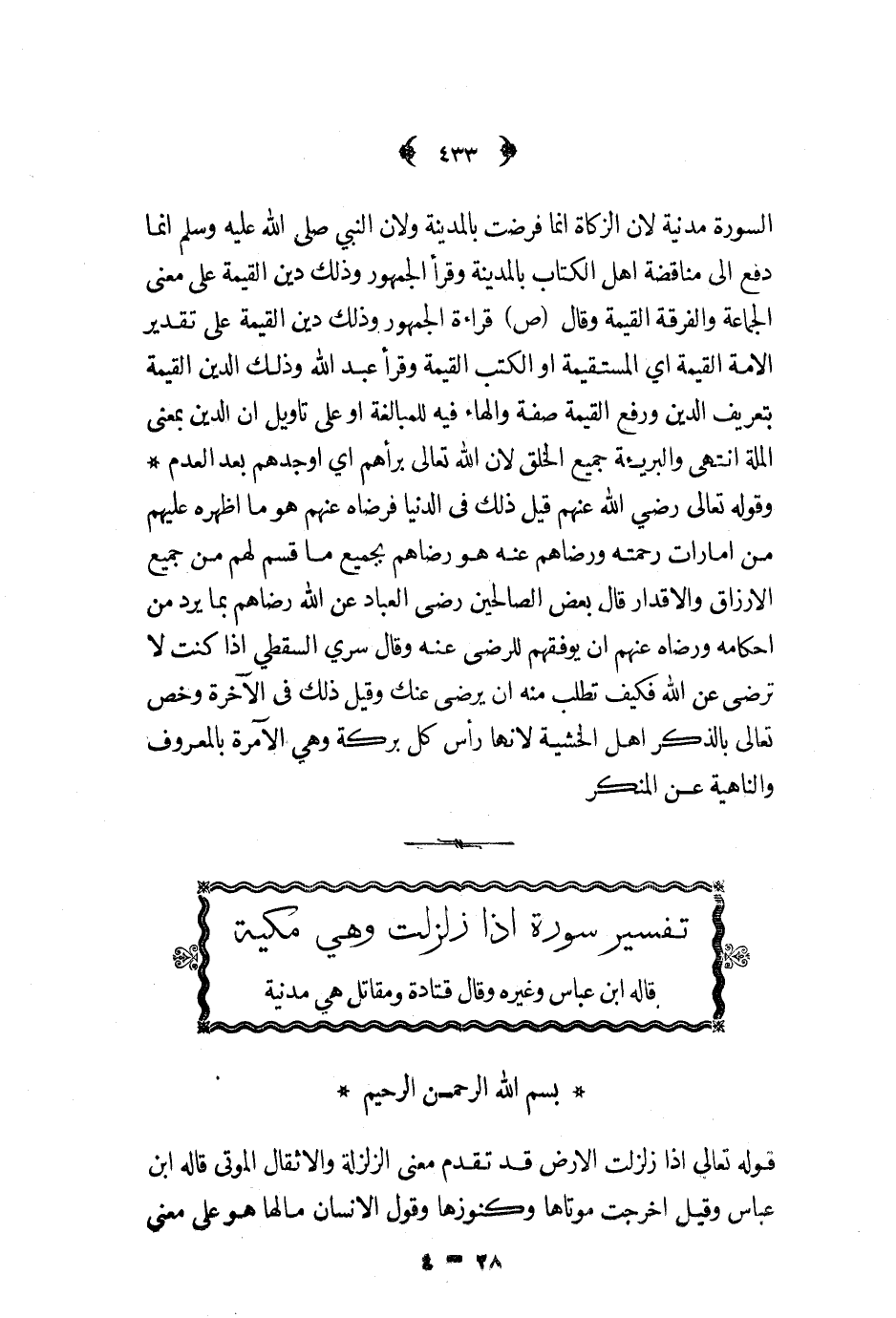 تفسير سورة اذا زلزلت وهي مكية قاله ابن عباس وغيره وقال قتادة ومقاتل هي مدنية