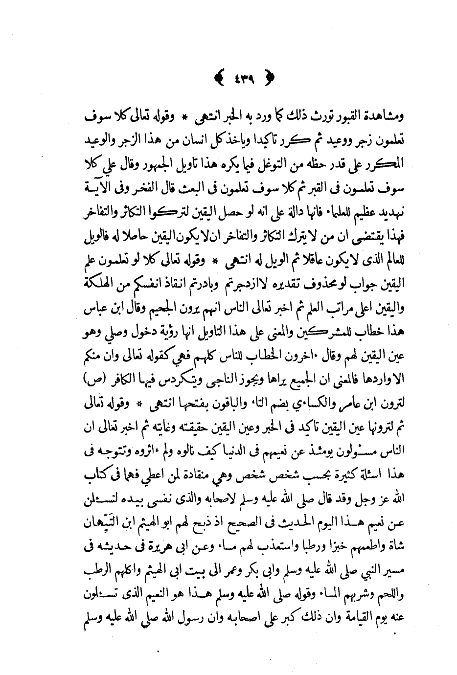وقوله تعالى ثم لترونها عين اليقين تاكيد في الخبر وعين اليقين حقيقته وغايته ثم اخبر تعالى ان الناس مسؤلون يومئذ عن نعيمهم في الدنيا كيف نالوه ولم ءاثروه وتتوجه في هذا اسئلة كثيرة بحسب شخص شخص وهي منقادة لمن اعطي فهما في كتاب الله عز و جل وقد قال ص - لاصحابه والذي نفسي بيده لتسئلن عن نعيم هذا اليوم الحديث في الصحيح اذ ذبح لهم ابو الهيثم ابن التيهان شاة واطعمهم خبزا ورطبا واستعذب لهم ماء وعن ابي هريرة في حديثه في مسير النبي ص - وابي بكر وعمر الى بيت ابي الهيثم واكلهم الرطب واللحم وشربهم الماء وقوله ص - هذا هو النعيم الذي تسئلون عنه يوم القيامة وان ذلك كبر على اصحابه وان رسول الله ص