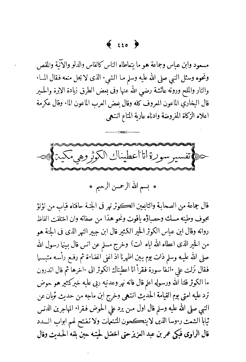قال جماعة من الصحابة والتابعين الكوثر نهر في الجنة حافتاه قباب من لؤلؤ مجوف وطينه مسك وحصباؤه ياقوت ونحو هذا من صفاته وان اختلفت الفاظ رواته وقال ابن عباس الكوثر الخير الكثير قال ابن جبير النهر الذي في الجنة هو من الخير الذي اعطاه الله اياه ت وخرج مسلم عن انس قال بينما رسول الله ص - ذات يوم بين اظهرنا اذ اغفى اغفاءة ثم رفع رأسه متبسما فقال نزلت علي ءانفا سورة فقرأ انا اعطيناك الكوثر الى ءاخرها ثم قال اتدرون ما الكوثر قلنا الله ورسوله اعلم قال فانه نهر وعدنيه ربى عليه خير كثير هو حوض ترد عليه امتى يوم القيامة الحديث انتهى وخرج ابن ماجه من حديث ثوبان عن النبي ص - قال اول من يرد علي الحوض فقراء المهاجرين الدنس ثيابا الشعث رءوسا الذين لا ينكحون المتنعمات ولا تفتح لهم ابواب السدد قال الراوى فبكى عمر بن عبد العزيز حتى اخضل لحيته حين بلغه الحديث وقال