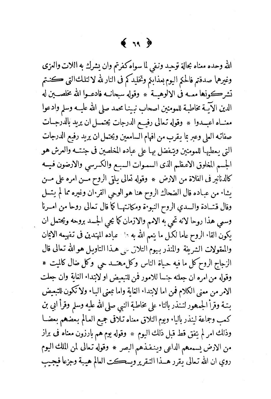 الله وحده معناه بحالة توحيد ونفي لما سواه كفرتم وأن يشرك به اللات والعزى وغيرهما صدقتم فالحكم اليوم بعذابكم وتخليدكم في النار لله لا لتلك التي كنتم تشركونها معه في الألوهية وقوله سبحانه فادعوا الله مخلصين له الدين الآية مخاطبة للمؤمنين أصحاب نبينا محمد صلى الله عليه و سلم وادعوا معناه اعبدوا وقوله تعالى رفيع الدرجات يحتمل أن يريد بالدرجات صفاته العلى وعبر بما يقرب من افهام السامعين ويحتمل ان يريد رفيع الدرجات التي يعطيها للمؤمنين ويتفضل بها على عباده المخلصين في جنته والعرش هو الجسم المخلوق الأعظم الذي السموات السبع والكرسي والأرضون فيه كالدنانير في الفلاة من الأرض وقوله تعالى يلقي الروح من أمره على من يشاء من عباده قال الضحاك الروح هنا هو الوحي القرآن وغيره مما لم يتل وقال قتادة والسدي الروح النبوءة ومكانتهما كما قال تعالى وروحا من أمرنا وسمي هذا روحا لأنه تحي به الأمم والأزمان كما يحي الجسد بروحه ويحتمل أن يكون القاء الروح عاما لكل ما ينعم الله له على عباده المهتدين في تفهيمه الأيمان والمعقولات الشريفة والمنذر بيوم التلاق ففي هذا التأويل هو الله تعالى قال الزجاج الروح كل ما فيه حياة الناس وكل مهتد حي وكل ضال كالميت وقوله من أمره أن جعلته جنسا للأمور فمن لتبعيض أو لابتداء الغاية وان جعلت الأمر من معنى الكلام فمن أما لابتداء الغاية وأما بمعنى الباء ولا تكون للتبعيض بتة وقرأ الجمهور لتنذر بالتاء على مخاطبة النبي صلى الله عليه و سلم وقرأ أبي بن كعب وجماعة لينذر بالياء ويوم التلاق معناه تلاقي جميع العالم بعضهم بعضا وذلك أمر لم يتفق قط قبل ذلك اليوم وقوله يوم هم بارزن معناه في براز من الأرض يسمعهم الداعي وينفذهم البصر وقوله تعالى لمن الملك اليوم روي ان الله تعالى يقرر هذا التقرير ويسكت العالم هيبة وجزعا فيجيب