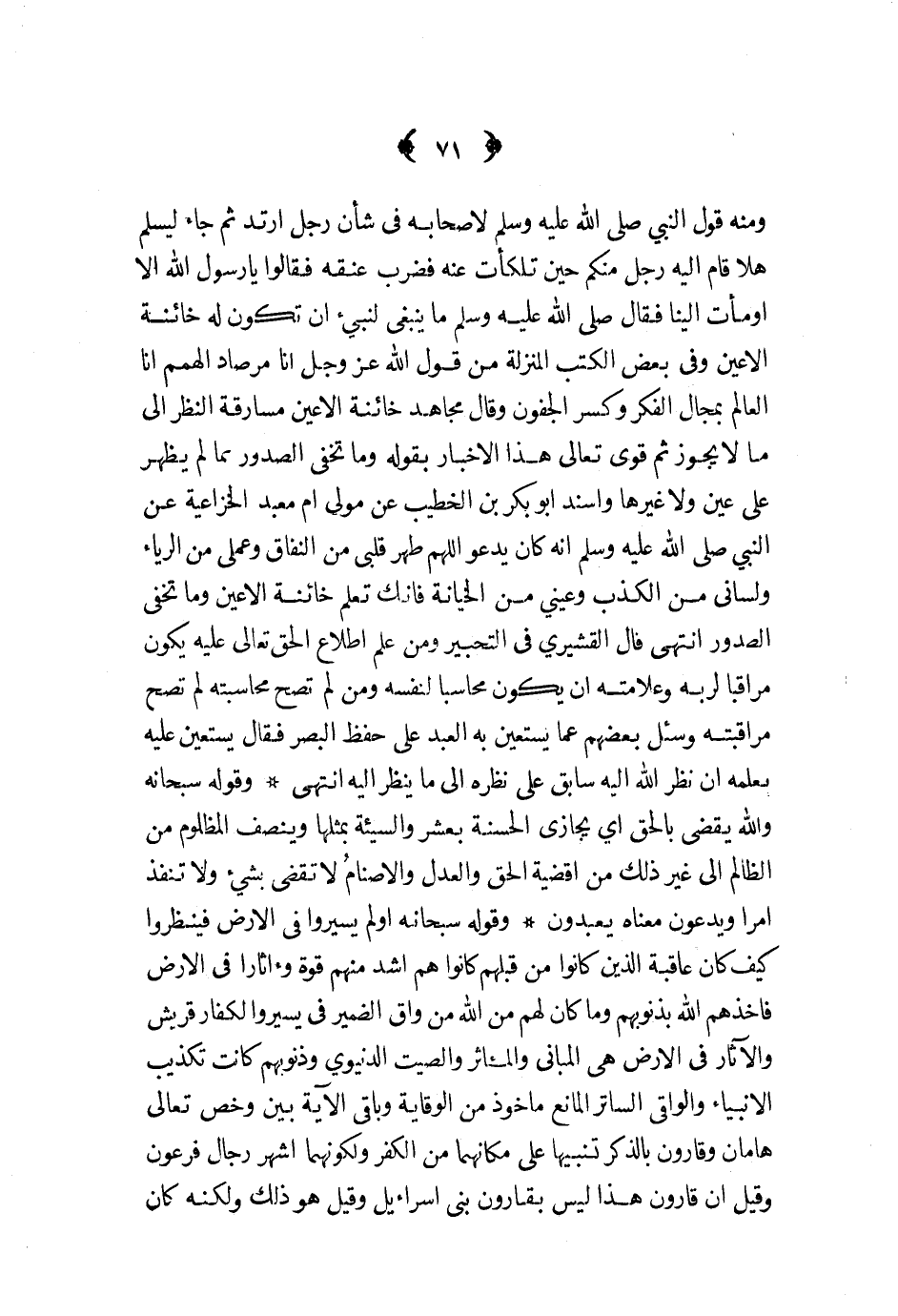 ومنه قول النبي صلى الله عليه و سلم لأصحابه في شأن رجل ارتد ثم جاء ليسلم هلا قام اليه رجل منكم حين تلكأت عنه فضرب عنقه فقالوا يا رسول الله الا أومأت الينا فقال صلى الله عليه و سلم ما ينبغي لنبي أن تكون له خائنة الأعين وفي بعض الكتب المنزلة من قول الله عز و جل أنا مرصاد الهمم انا العالم بمجال الفكر وكسر الجفون وقال مجاهد خائنة الأعين مسارقة النظر الى ما لا يجوز ثم قوى تعالى هذا الاخبار بقوله وما تخفي الصدور بما لم يظهر على عين ولا غيرها واسند أبو بكر بن الخطيب عن مولى أم معبد الخزاعية عن النبي صلى الله عليه و سلم أنه كان يدعو اللهم طهر قلبي من النفاق وعملي من الرياء ولساني من الكذب وعيني من الخيانة فانك تعلم خائنة الأعين وما تخفي الصدور انتهى قال القشيري في التحبير ومن علم اطلاع الحق تعالى عليه يكون مراقبا لربه وعلامته أن يكون محاسبا لنفسه ومن لم تصح محاسبته لم تصح مراقبته وسئل بعضهم عما يستعين به العبد على حفظ البصر فقال يستعين عليه بعلمه ان نظر الله اليه سابق على نظره الى ما ينظر اليه انتهى وقوله سبحانه والله يقضي بالحق أي يجازي الحسنة بعشر والسيئة بمثلها وينصف المظلوم من الظالم الى غير ذلك من أقضية الحق والعدل والأصنام لا تقضي بشيء ولا تنفذ أمرا ويدعون معناه يعبدون وقوله سبحانه أولم يسيروا في الأرض فينظروا كيف كان عاقبة الذين كانوا من قبلهم كانوا هم أشد منهم قوة وآثارا في الأرض فأخذهم الله بذنوبهم وما كان لهم من الله من واق الضمير في يسيروا لكفار قريش والآثار في الارض هي المباني والمآثر والصيت الدنيوي وذنوبهم كانت تكذيب الأنبياء والواقي الساتر المانع مأخوذ من الوقاية وباقي الآية بين وخص تعالى هامان وقارون بالذكر تنبيها على مكانهما من الكفر ولكونهما أشهر رجال فرعون وقيل أن قارون هذا ليس بقارون بني اسرائيل وقيل هو ذلك ولكنه كان