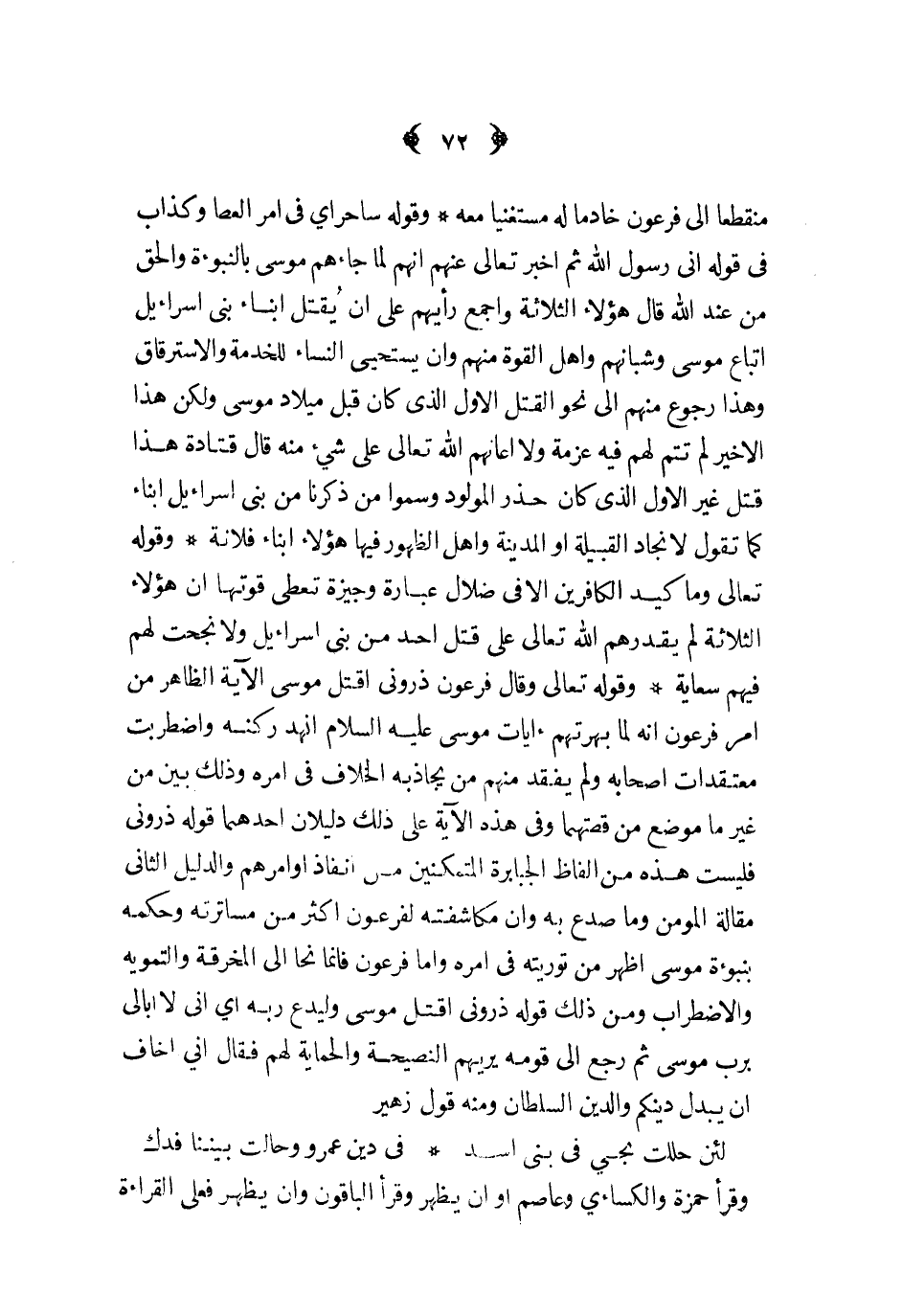 منقطعا الى فرعون خادما له مستغنيا معه وقوله ساحر أي في أمر العصا وكذاب في قوله أني رسول الله ثم أخبر تعالى عنهم أنهم لما جاءهم موسى بالنبوءة والحق من عند الله قال هؤلاء الثلاثة وأجمع رأيهم على أن يقتل ابناء بني اسرائيل اتباع موسى وشبانهم وأهل القوة منهم وأن يستحي النساء للخدمة والاسترقاق وهذا رجوع منهم الى نحو القتل الأول الذي كان قبل ميلاد موسى ولكن هذا الأخير لم تتم لهم فيه عزمة ولا أعانهم الله تعالى على شيء منه قال قتادة هذا قتل غير الأول الذي كان حذر المولود وسموا من ذكرنا من بني اسرائيل أبناء كما تقول لانجاد القبيلة أو المدينة وأهل الظهور فيها هؤلاء أبناء فلانة وقوله تعالى وما كيد الكافرين الا في ضلال عبارة وجيزة تعطي قوتها أن هؤلاء الثلاثة لم يقدرهم الله تعالى على قتل احد من بني اسرائيل ولا نجحت لهم فيهم سعاية وقوله تعالى وقال فرعون ذروني أقتل موسى الآية الظاهر من أمر فرعون أنه لما بهرتهم آيات موسى عليه السلام أنهد ركنه واضطربت معتقدات أصحابه ولم يفقد منهم من يجاذبه الخلاف في أمره وذلك بين من غير ما موضع من قصتهما وفي هذه الآية على ذلك دليلان أحدهما قوله ذروني فليست هذه من ألفاظ الجبابرة المتمكنين من انفاذ أوامرهم والدليل الثاني مقالة المؤمن وما صدع به وان مكاشفته لفرعون أكثر من مساترته وحكمه بنبوءة موسى أظهر من توريته في أمره وأما فرعون فانما نحا الى المخرقة والتمويه والاضطراب ومن ذلك قوله ذروني أقتل موسى وليدع ربه أي أني لا أبالي برب موسى ثم رجع الى قومه يريهم النصيحة والحماية لهم فقال اني أخاف أن يبدل دينكم والدين السلطان ومنه قول زهير ... لئن حللت بحي في بني أسد ... في دين عمرو وحالت بيننا فدك ...