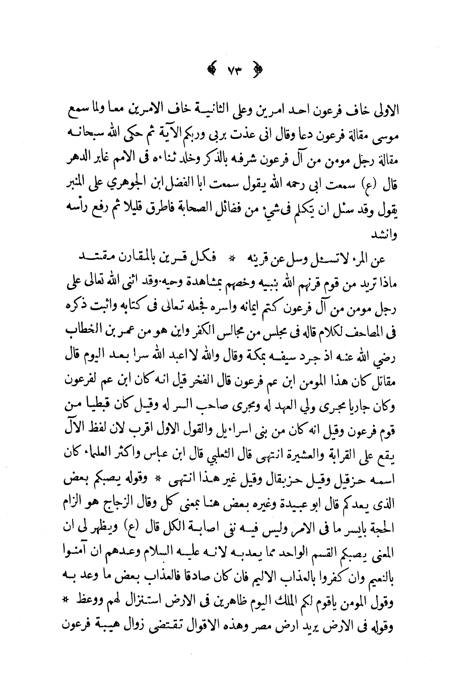 الأولى خاف فرعون أحد أمرين وعلى الثانية خاف الأمرين معا ولما سمع موسى مقالة فرعون دعا وقال أني عذت بربي وربكم الآية ثم حكى الله سبحانه مقالة رجل مؤمن ومن آل فرعون شرفه بالذكر وخلد ثناؤه في الأمم غابر الدهر قال ع سمعت أبي رحمه الله يقول سمعت ابا الفضل الله الجوهري على المنبر يقول وقد سئل أن يتكلم في شيء من فضائل الصحابة فأطرق ثم رفع رأسه وأنشد ... عن المرء لا تسئل وسل عن قرينه ... فكل قرين بالمقارن مقتد ...