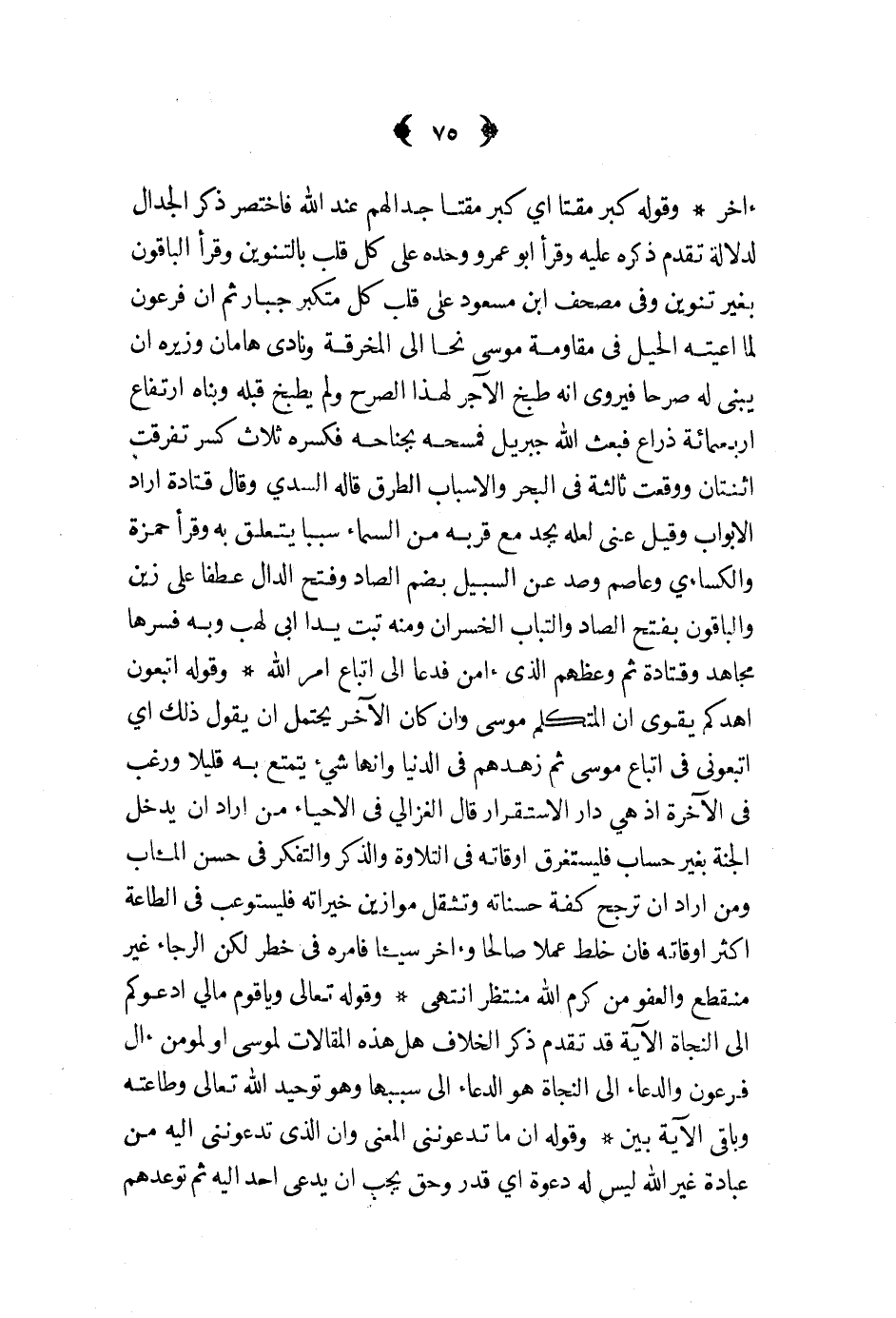 آخر وقوله كبر مقتا أي كبر مقتا جدالهم عند الله فاختصر ذكر الجدال لدلالة تقدم ذكره عليه وقرأ أبو عمرو وحده على كل قلب بالتنوين وقرأ الباقون بغير تنوين وفي مصحف ابن مسعود على قلب كل متكبر جبار ثم ان فرعون لما أعيته الحيل في مقاومة موسى نحا الى المخرقة ونادى هامان وزيره أن يبني له صرحا فيروي أنه طبخ الآجر لهذا الصرح ولم يطبخ قبله وبناه ارتفاع أربعمائة ذراع فبعث الله جبريل فمسحه بجناحه فكسره ثلاث كسر تفرقت اثناتان ووقعت ثالثة في البحر والأسباب الطرق قاله السدي وقال قتادة اراد الأبواب وقيل عنى لعله يجد مع قربه من السماء سببا يتعلق به وقرأ حمزة والكسائي وعاصم وصد عن السبيل بضم الصاد وفتح الدال عطفا على زين والباقون بفتح الصاد والتباب الخسران ومنه تبت يدا أبي لهب وبه فسرها مجاهد وقتادة ثم وعظهم الذي آمن فدعا الى اتباع أمر الله وقوله اتبعون أهدكم يقوي أن المتكلم موسى وإن كان الآخر يحتمل أن يقول ذلك أي اتبعوني في اتباع موسى ثم زهدهم في الدنيا وانها شيء يتمتع به قليلا ورغب في الآخرة اذ هي دار الاستقرار قال الغزالي في الاحياء من أراد أن يدخل الجنة بغير حساب فليستغرق أوقاته في التلاوة والذكر والتفكر في حسن المئاب ومن اراد أن ترجح كفة حسناته وتثقل موازين خيراته فليستوعب في الطاعة أكثر أوقاته فان خلط عملا صالحا وآخر سيئا فأمره في خطر لكن الرجاء غير منقطع والعفو من كرم الله منتظر انتهى وقوله تعالى ويا قوم مالي أدعوكم الى النجاة الآية قد تقدم ذكر الخلاف هل هذه المقالات لموسى أو لمؤمن آل فرعون والدعاء الى النجاة هو الدعاء الى سببها وهو توحيد الله تعالى وطاعته وباقي الآية بين وقوله أن ما تدعونني المعنى وأن الذي تدعونني اليه من عبادة غير الله ليس له دعوة أي قدر وحق يجب أن يدعي أحد اليه ثم توعدهم