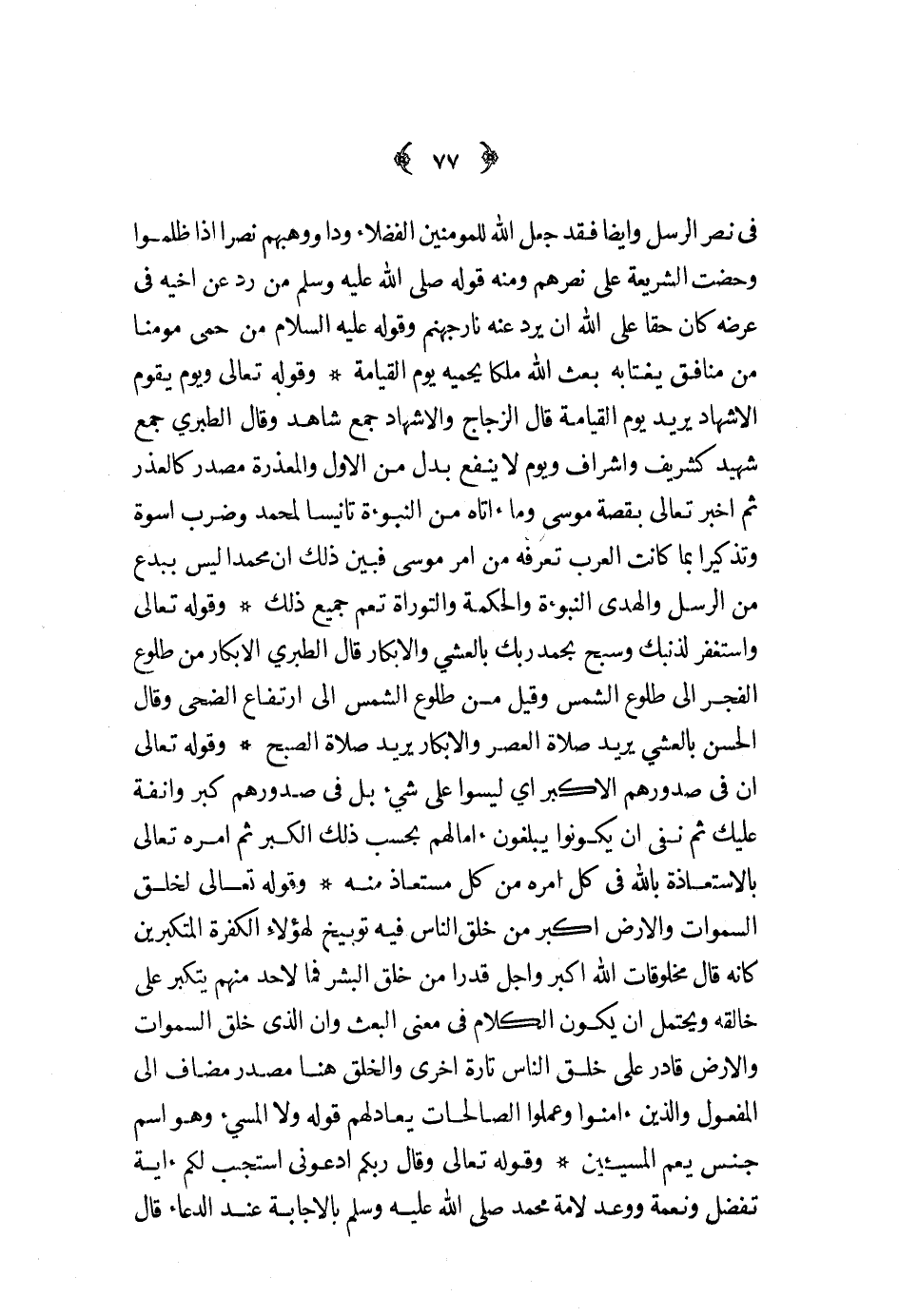 في نصر الرسل وأيضا فقد جعل الله للمؤمنين الفضلاء ودا ووهبهم نصرا اذا ظلموا وحضت الشريعة على نصرهم ومنه قوله صلى الله عليه و سلم من رد عن أخيه في عرضه كان حقا على الله أن يرد عنه نار جهنم وقوله عليه السلام من حمى مؤمنا من منافق يغتابه بعث الله ملكا يحميه يوم القيامة وقوله تعالى ويوم يقوم الأشهاد يريد يوم القيامة قال الزجاج والاشهاد جمع شاهد وقال الطبري جمع شهيد كشريف واشراف ويوم لا ينفع بدل من الأول والمعذرة مصدر كالعذر ثم اخبر تعالى بقصة موسى وما أتاه من النبوءة تأنيسا لمحمد وضرب أسوة وتذكيرا بما كانت العرب تعرفه من أمر موسى فبين ذلك أن محمدا ليس ببدع من الرسل والهدى والنبوءة والحكمة والتوراة تعم جميع ذلك وقوله تعالى واستغفر لذنبك وسبح بحمد ربك بالعشي والابكار قال الطبري الابكار من طلوع الفجر الى طلوع الشمس وقيل من طلوع الشمس الى ارتفاع الضحى وقال الحسن بالعشي يريد صلاة العصر والابكار يريد صلاة الصبح وقوله تعالى أن في صدورهم الأكبر أي ليسوا على شيء بل في صدورهم كبر وأنفة عليك ثم نفي أن يكونوا يبلغون آمالهم بحسب ذلك الكبير ثم أمره تعالى بالاستعاذة بالله في كل أمره من كل مستعاذ منه وقوله تعالى لخلق السماوات والأرض أكبر من خلق الناس فيه توبيخ لهؤلاء الكفرة المتكبرين كأنه قال مخلوقات الله أكبر وأجل قدرا من خلق البشر فما لأحد منهم يتكبر على خالقه ويحتمل أن يكون الكلام في معنى البعث وأن الذي خلق السمالوات والأرض قادر على خلق الناس تارة أخرى والخلق هنا مصدر مضاف الى المفعول والذين آمنوا وعملوا الصالحات يعادلهم قوله ولا المسيء وهو اسم جنس يعم المسيئين وقوله تعالى وقال ربكم ادعوني أستجب لكم آية تفضل ونعمة ووعد لامة محمد صلى الله عليه و سلم بالاجابة عند الدعاء قال