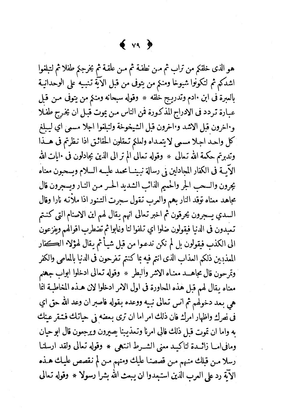 هو الذي خلقكم من تراب ثم من نطفة ثم من علقة ثم يخرجكم طفلا ثم لتبلغوا أشدكم ثم لتكونوا شيوخا ومنكم من يتوفى من قبل الآية تنبيه على الوحدانية بالعبرة في ابن آدم وتدريج خلقه وقوله سبحانه ومنكم من يتوفى من قبل عبارة تردد في الادراج المذكورة فمن الناس من يموت قبل أن يخرج طفلا وآخرون قبل الأشد وآخرون قبل الشيخوخة ولتبلغوا أجلا مسمى أي ليبلغ كل واحد أجلا مسمى لا يتعداه ولعلكم تعقلون الحقائق اذا نظرتم في هذا وتدبرتم حكمة الله تعالى وقوله تعالى الم تر الى الذين يجادلون في آيات الله الآية في الكفار المجادلين في رسالة نبينا محمد صلى الله عليه و سلم ويسحبون معناه يجرون والسحب الجر والحميم الذائب الشديد الحر من النار ويسجرون قال مجاهد معناه توقد النار بهم والعرب تقول سجرت التنور اذا ملأته نارا وقال السدي يسجرون يحرقون ثم أخبر تعالى أنهم يقال لهم أين الأصنام التي كنتم تعبدون في الدنيا فيقولون ضلوا أي تلفوا لنا وغابوا ثم تضطرب أقوالهم ويفزعون الى الكذب فيقولون بل لم نكن ندعوا من قبل شيئا ثم يقال لهؤلاء الكفار المعذبين ذلكم العذاب الذي أنتم فيه بما كنتم تفرحون في الدنيا بالمعاصي والكفر وتمرحون قال مجاهد معناه الأشر والبطر وقوله تعالى ادخلوا أبواب جهنم معناه يقال لهم قبل هذه المحاورة في أول الأمر ادخلوا لأن هذه المخاطبة انما هي بعد دخولهم ثم أنس تعالى نبيه ووعده بقوله فاصبر ان وعد الله حق أي في نصرك واظهار أمرك فان ذلك أمرا اما ان ترى بعضه في حياتك فتقر عينك به واما أن تموت قبل ذلك فالى أمرنا وتعذيبنا يصيرون ويرجعون قال أبو حيان وما في أما زائدة لتأكيد معنى الشرط انتهى وقوله تعالى ولقد أرسلنا رسلا من قبلك منهم من قصصنا عليك ومنهم من لم نقصص عليك هذه الآية رد على العرب الذين استبعدوا أن يبعث الله بشرا رسولا وقوله تعالى