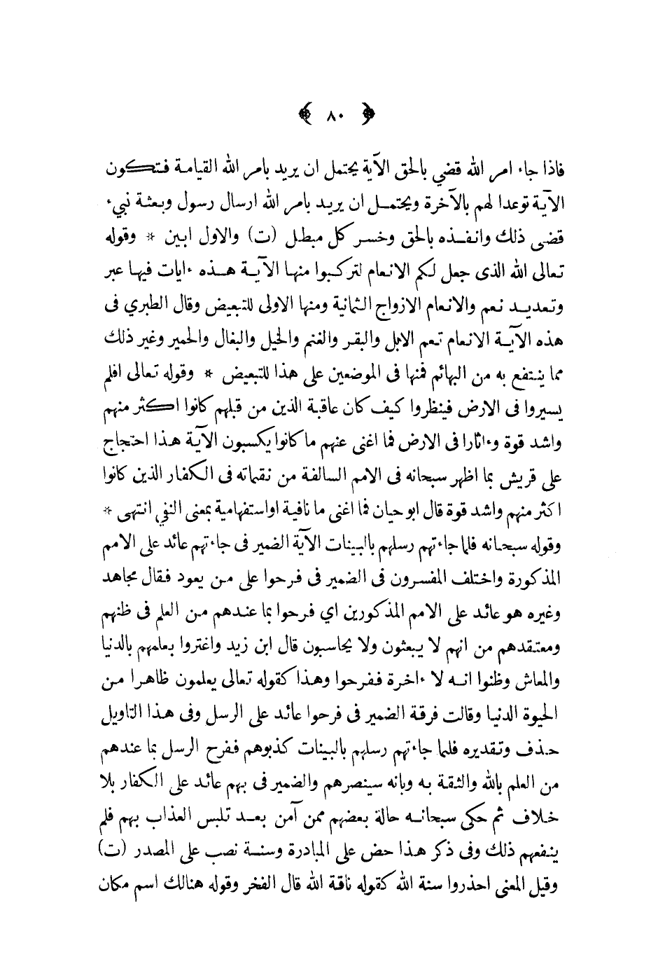فاذا جاء أمر الله قضي بالحق الآية يحتمل أن يريد بأمر الله القيامة فتكون الآية توعدا لهم بالآخرة ويحتمل أن يريد بأمر الله ارسال رسول وبعثة نبي قضى ذلك وأنفذه بالحق وخسر كل مبطل ت والاول أبين وقوله تعالى الله الذي جعل لكم الأنعام لتركبوا منها الآية هذه آيات فيها عبر وتعديد نعم والأنعام الازواج الثمانية ومنها الأولى للتبعيض وقال الطبري في هذه الآية الانعام تعم الابل والبقر والغنم والخيل والبغال والحمير وغير ذلك مما ينتفع به من البهائم فمنها في الموضعين على هذا للتبعيض وقوله تعالى أفلم يسيروا في الأرض فينظروا كيف كان عاقبة الذين من قبلهم كانوا اكثر منهم وأشد قوة وآثارا في الأرض فما أغنى عنهم ما كانوا يكسبون الآية هذا احتجاج على قريش بما أظهر سبحانه في الأمم السالفة من نقماته في الكفار الذين كانوا أكثر منهم وأشد قوة قال أبو حيان فما أغنى ما نافية أو استفهامية بمعنى النفي انتهى وقوله سبحانه فلما جاءتهم رسلهم بالبينات الآية الضمير في جاءتهم عائد على الأمم المذكورة واختلف المفسرون في الضمير في فرحوا على من يعود فقال مجاهد وغيره هو عائد على الأمم المذكورين أي فرحوا بما عندهم من العلم في ظنهم ومعتقدهم من انهم لا يبعثون ولا يحاسبون قال ابن زيد واغتروا بعلمهم بالدنيا والمعاش وظنوا انه لا آخرة ففرحوا وهذا كقوله تعالى يعلمون ظاهرا من الحياة الدنيا وقالت فرقة الضمير في فرحوا عائد على الرسل وفي هذا التأويل حذف وتقديره فلما جاءتهم رسلهم بالبينات كذبوهم ففرح الرسل بما عندهم من العلم بالله والثقة به وبأنه سينصرهم والضمير في بهم عائد على الكفار بلا خلاف ثم حكى سبحانه حالة بعضهم ممن آمن بعد تلبس العذاب بهم فلم ينفعهم ذلك وفي ذكر هذا حض على المبادرة وسنة نصب على المصدر ت وقيل المعنى احذروا سنة لله كقوله ناقة الله قال الفخر وقوله هنالك اسم مكان