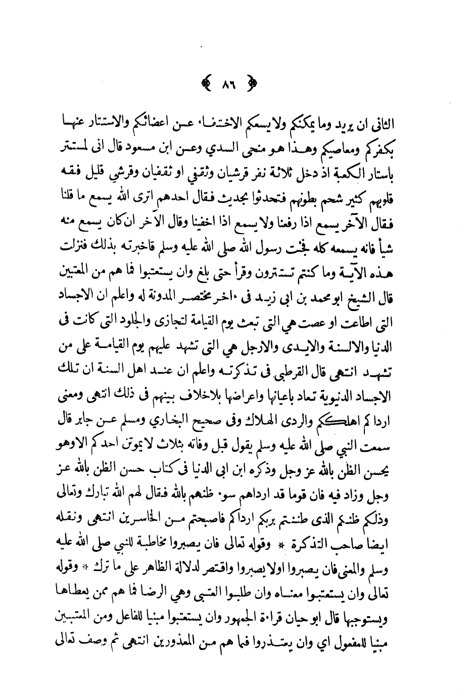 الثاني أن يريد وما يمكنكم ولا يسعكم الاختفاء عن أعضائكم والاستتار عنها بكفركم ومعاصيكم وهذا هو منحي السدي وعن ابن مسعوج قال اني لمستتر بأستار الكعبة اذ دخل ثلاثة نفر قرشيان وثقفي أو ثقفيان وقرشي قليل فقه قلوبهم كثير شحم بطونهم فتحدثوا بحديث فقال أحدهم أترى الله يسمع ما قلنا فقال الآخر يسمع اذا رفعنا ولا يسمع اذا أخفينا وقال الآخر إن كان يسمع منه شيئا فانه يسمعه كله فجئت رسول الله صلى الله عليه و سلم فأخبرته بذلك فنزلت هذه الآية وما كنتم تستترون وقرأ حتى بلغ وان يستعتبوا فما هم من المعتبين قال الشيخ أبو محمد بن ابي زيد في آخر مختصر المدونة له واعلم أن الأجساد التي أطاعت أو عصت هي التي تبعث يوم القيامة لتجازي والجلود التي كانت في الدنيا والألسنة والأيدي والأرجل هي التي تشهد عليهم يوم القيامة على من تشهد انتهى قال القرطبي في تذكرته واعلم أن عند أهل السنة أن تلك الأجساد الدنيوية تعاد بأعيانها وأعراضها بلا خلاف بينهم في ذلك انتهى ومعنى أرادكم أهلككم والردى الهلاك وفي صحيح البخاري ومسلم عن جابر قال سمعت النبي صلى الله عليه و سلم يقول قبل وفاته ثلاث لا يموتن أحدكم الا وهو يحسن الظن بالله عز و جل وذكره ابن أبي الدنيا في كتاب حسن الظن بالله عز و جل وزاد فيه فان قوما قد أرداهم سوء ظنهم بالله فقال لهم الله تبارك وتعالى وذلكم ظنكم الذي ظننتم بربكم ارداكم فأصبحتم من الخاسرين انتهى ونقله أيضا صاحب التذكرة وقوله تعالى فإن يصبروا مخاطبة للنبي صلى الله عليه و سلم والمعنى فان يصبروا أولا يصبروا واقتصر لدلالة الظاهر على ما ترك وقوله تعالى وان يستعتبوا معناه وان طلبوا العتبى وهي الرضا فما هم ممن يعطاها ويستوجبها قال أبو حيان قراءة الجمهور وأن يستعتبوا مبنيا للفاعل ومن المعتبين مبنيا للمفعول أي وأن يعتذروا فما هم من المعذروين انتهى ثم وصف تعالى