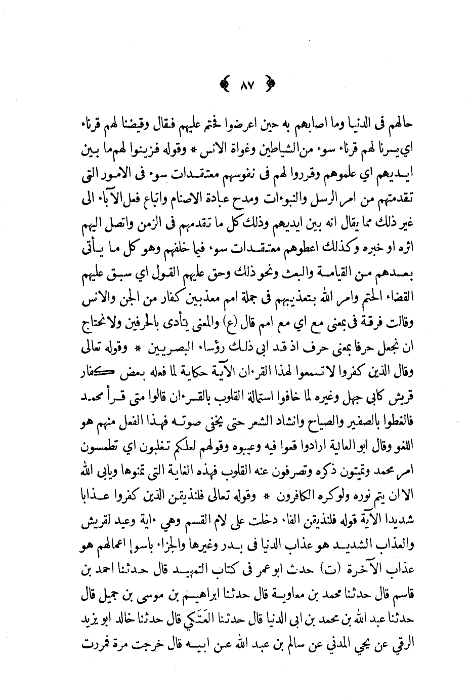 حالهم في الدنيا وما أصابهم به حين أعرضوا فختم عليهم فقال وقيضنا لهم قرناء أي يسرنا لهم قرناء سوء من الشياطين وغواة الانس وقوله فزينوا لهم ما بين أيديهم أي علموهم وقرروا لهم في نفوسهم ومعتقدات سوء في الأمور التي تقدمتهم من أمر الرسل والنبوءات ومدح عبادة الأصنام واتباع فعل الآباء الى غير ذلك مما يقال أنه بين ايديهم وذلك كل ما تقدمهم في الزمن واتصل اليهم أثره أو خبره وكذلك أعطوهم معتقدات سوء فيما خلفهم وهو كل ما يأتي بعدهم من القيامة والبعث ونحو ذلك وحق عليهم القول أي سبق عليهم القضاء الحتم وأمر الله بتعذيبهم في جملة أمم معذبين كفار من الجن والانس وقالت فرقة في بمعنى مع أي مع أمم قال ع والمعنى يتأدى بالحرفين ولا نحتاج أن نجعل حرفا بمعنى حرف اذ قد أبى ذلك رؤساء البصريين وقوله تعالى وقال الذين كفروا لا تسمعوا لهذا القرآن الآية حكاية لما فعله بعض كفار قريش كأبي جهل وغيره لما خافوا استمالة القلوب بالقرآن قالوا متى قرأ محمد فالغطوا بالصفير والصياح وانشاد الشعر حتى يخفي صوته فهذا الفعل منهم هو اللغو وقال أبو العالية ارادوا قعوا فيه وعيبوه وقولهم لعلكم تغلبون أي تطمسون أمر محمد وتميتون ذكره وتصرفون عنه القلوب فهذه الغاية التي تمنوها ويأبى الله الا أن يتم نوره ولو كره الكافرون وقوله تعالى فلنذيقن الذين كفروا عذابا شديدا الآية قوله لنذيقن الفاء دخلت على لام القسم وهي آية وعيد لقريش والعذاب الشديد هو عذاب الدنيا في بدر وغيرها والجزاء بأسوأ أعمالهم هو عذاب الآخرة ت حدث ابو عمر في كتاب التمهيد قال حدثنا احمد بن قاسم قال حدثنا محمد بن معاوية قال حدثنا ابراهيم بن موسى بن جميل قال حدثنا عبد الله بن محمد بن ابي الدنيا قال حدثنا العتكي قال حدثنا خالد أبو يزيد الرقي عن يحيى المدني عن سالم بن عبد الله عن أبيه قال خرجت مرة فمررت