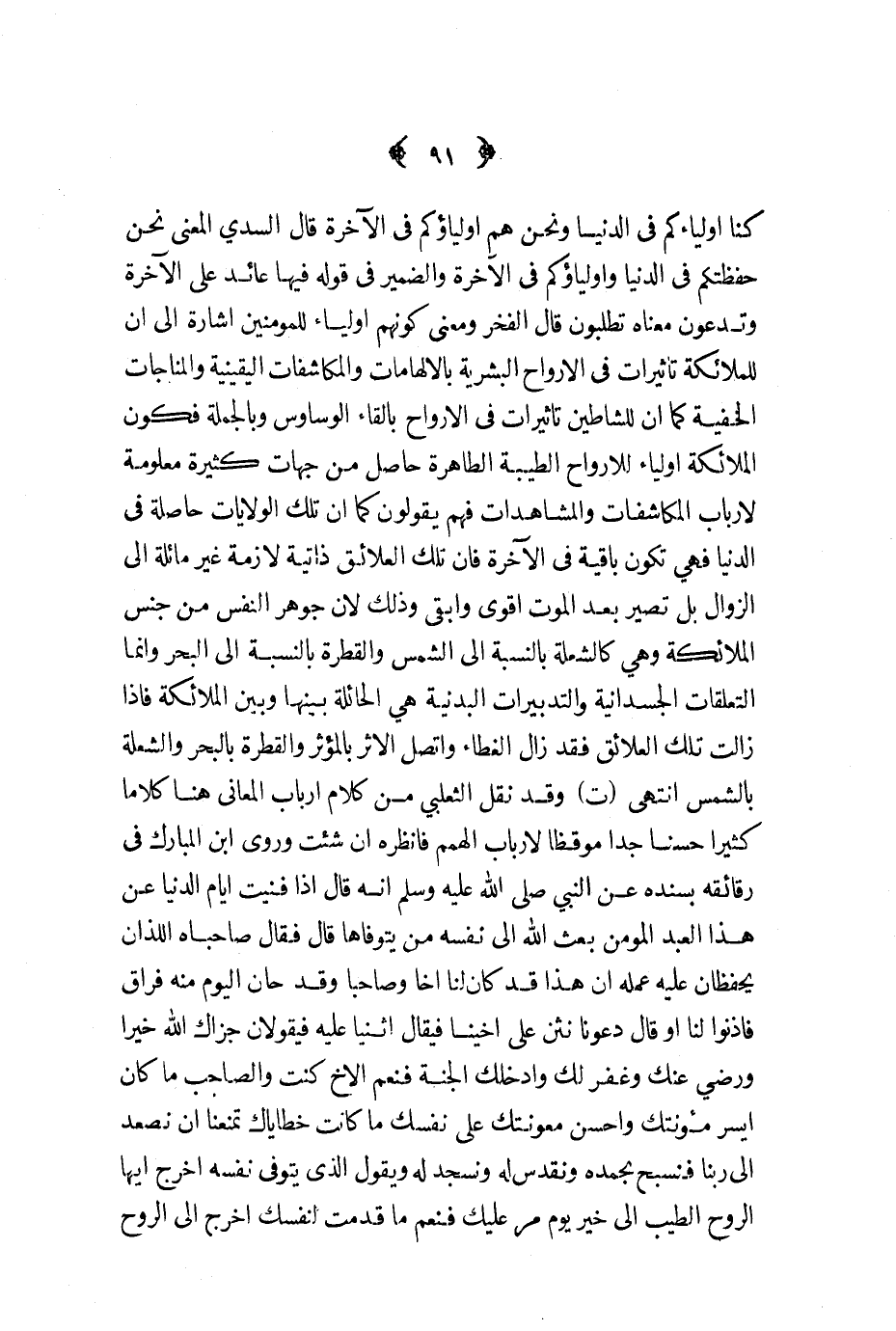 كنا أولياءكم في الدنيا ونحن هم أولياءكم في الآخرة قال السدي المعنى نحن حفظتكم وأولياؤكم في الآخرة والضمير في قوله فيها عائد على الآخرة وتدعون معناه تطلبون قال الفخر ومعنى كونهم أولياء للمؤمنين اشارة الى أن للملائكة تأثيرات في الأرواح البشرية بالالهامات والمكاشفات اليقينية والمناجات الخفية كما أن للشياطين تأثيرات في الأرواح بالقاء الوساوس وبالجملة فكون الملائكة أولياء للأرواح الطيبة الطاهرة حاصل من جهات كثيرة معلومة لأرباب المكاشفات والمشاهدات فهم يقولون كما أن تلك الولايات الحاصلة في الدنيا فهي تكون باقية في الآخرة فإن تلك العلائق ذاتية لازمة غير مائلة الى الزوال بل تصير بعد الموت أقوى وأبقى وذلك لأن جوهر النفس من جنس الملائكة وهي كالشعلة بالنسبة الى الشمس والقطرة بالنسبة الى البحر وانما التعلقات الجسدانية والتدبيرات البدنية هي الحائلة بينها وبين الملائكة فاذا زالت تلك العلائق فقد زال الغطاء واتصل الأثر بالمؤثر والقطرة بالبحر والشعلة بالشمس انتهى ت وقد نقل الثعلبي من كلام أرباب المعاني هنا كلاما كثيرا حسنا جدا موقظا لأرباب الهمم فانظره ان شئت وروى ابن المبارك في رقائقه بسنده عن النبي صلى الله عليه و سلم إنه قال اذا فنيت أيام الدنيا عن هذا العبد المؤمن بعث الله الى نفسه من يتوفاها قال فقال صاحباه اللذان يحفظان عليه عمله أن هذا قد كان لنا أخا وصاحبا وقد حان اليوم منه فراق فأذنوا لنا أو قال دعونا نثن على أخينا فيقال أثنيا عليه فيقولان جزاك الله خيرا ورضي عنك وغفر لك وأدخلك الجنة فنعم الأخ كنت والصاحب ما كان أيسر مؤنتك وأحسن معونتك على نفسك ما كانت خطاياك تمنعنا أن نصعد الى ربنا فنسبح بحمده ونقدس له ونسجد د له ويقول الذي يتوفى نفسه أخرج أيها الروح الطيب الى خير يوم مر عليك فنعم ما قدمت لنفسك أخرج الى الروح