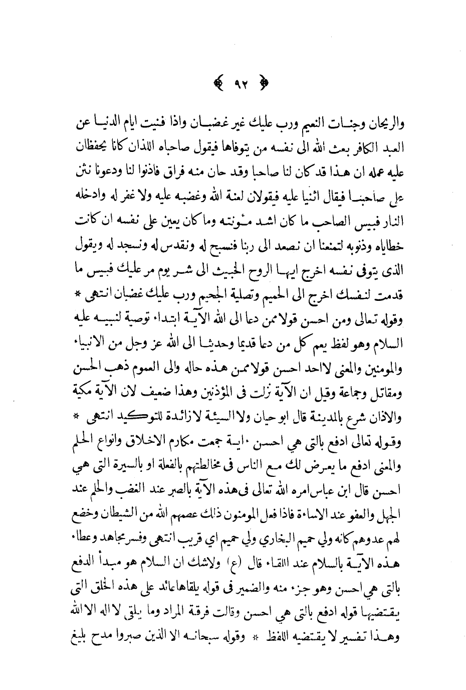 والريحان وجنات النعيم ورب عليك غير غضبان واذا فنيت أيام الدنيا عن العبد الكافر بعث الله الى نفسه من يتوفاها فيقول صاحباه اللذان كانا يحفظان عليه عمله أن هذا قد كان لنا صاحبا وقد حان منه فراق فاذنوا لنا ودعونا نثن على صاحبنا فيقال أثينا عليه فيقولان لعنة الله وغضبه عليه ولا غفر له وأدخله النار فبيس الصاحب ما كان أشد مؤنته وما كان يعين على نفسه إن كانت خطاياه وذنوبه لتمنعنا الى أن نصعد الى ربنا فنسبح له ونقدس له ونسجد له ويقول الذي يتوفى نفسه اخرج أيها الروح الخبيث الى شر يوم مر عليك فبيس ما قدمت لنفسك اخرج الى الحميم وتصلية الجحيم ورب عليك غضبان انتهى وقوله تعالى ومن أحسن قولا ممن دعا الى الله الآية ابتداء توصية لنبيه عليه السلام وهو لفظ يعم كل من دعا قديما وحديثا الى الله عز و جل من الأنبياء والمؤمنين والمعنى لا أحد أحسن قولا ممن هذه حاله والى العموم ذهب الحسن ومقاتل وجماعة وقيل أن الآية نزلت في المؤذنين وهذا ضعيف لأن الآية مكية والأذان شرع بالمدينة قال أبو حيان ولا السيئة لا زائدة للتوكيد انتهى وقوله تعالى ادفع بالتي هي أحسن آية جمعت مكارم الاخلاق وأنواع الحلم والمعنى ادفع ما يعرض لك مع الناس في مخالطتهم بالفعلة أو بالسيرة التي هي أحسن قال ابن عباس أمره الله تعالى في هذه الآية بالصبر عند الغضب والحلم عند الجهل والعفو عند الاساءة فاذا فعل المؤمنون ذلك عصمهم الله من الشيطان وخضع لهم عدوهم كأنه ولي حميم البخاري ولي حميم أي قريب انتهى وفسر مجاهد وعطاء هذه الآية بالسلام عند اللقاء قال ع ولا شك أن السلام هو مبدأ الدفع بالتي هي أحسن وهو جزء منه والضمير في قوله يلقاها عائد على هذه الخلق التي يقتضيها قوله ادفع بالتي هي أحسن وقالت فرقة المراد وما يلقي لا اله الا الله وهذا تفسير لا يقتضيه اللفظ وقوله سبحانه الا الذين صبروا مدح بليغ