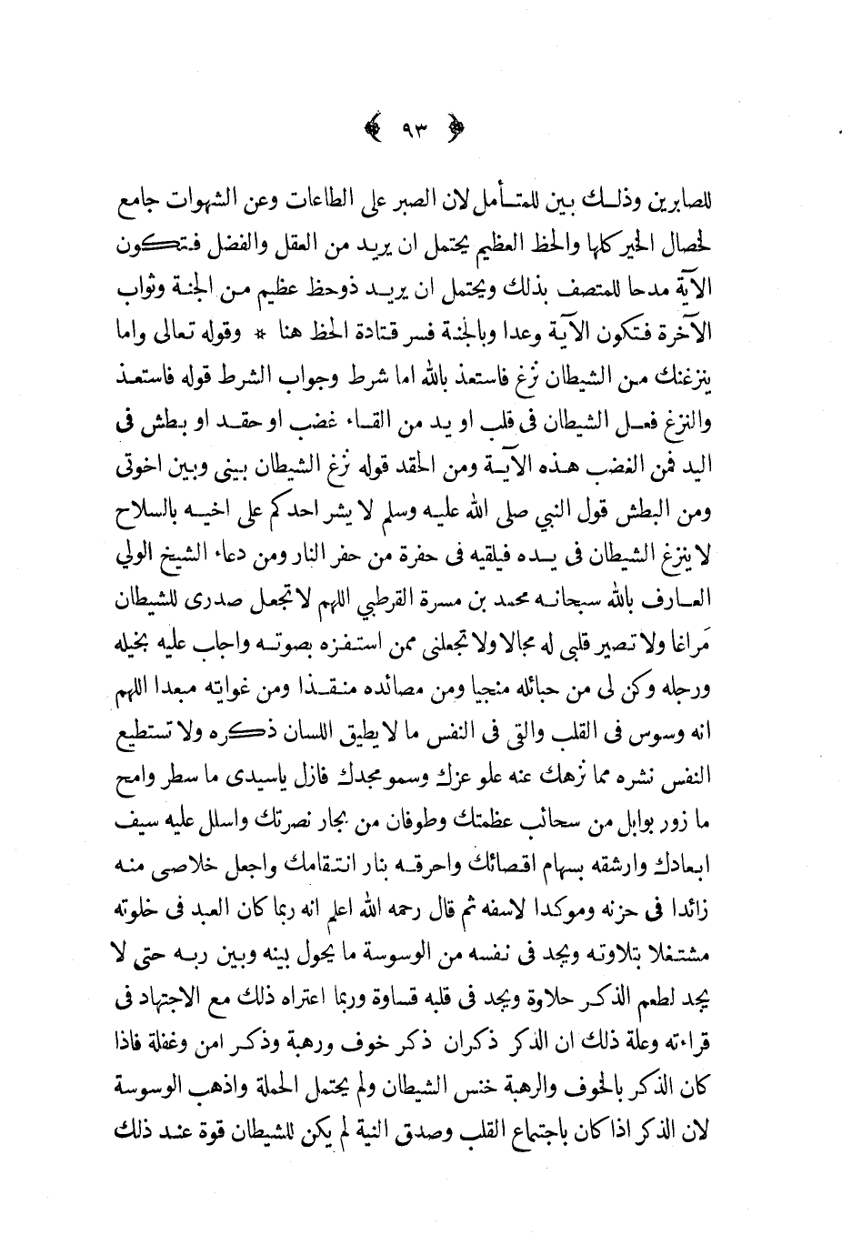 للصابرين وذلك بين المتأمل لأن الصبر على الطاعات وعن الشهوات جامع لخصال الخير كلها والحظ العظيم يحتمل أن يريد من العقل والفضل فتكون الآية مدحا للمتصف بذلك ويحتمل أن يريد ذو حظ عظيم من الجنة وثواب الآخرة فتكون الآية وعدا وبالجنة فسر قتادة الحظ هنا وقوله تعالى وإما ينزغنك الشيطان نزغ فاستعذ بالله أما شرط وجواب الشرط قوله فاستعذ والنزغ فعل الشيطان في قلب أو يد من القاء غضب أو حقد أو بطش في اليد فمن الغضب هذه الآية ومن الحقد قوله نزغ الشيطان بيني وبين اخوتي ومن البطش قول النبي صلى الله عليه و سلم لا يشر أحدكم على أخيه بالسلاح لا ينزغ الشيطان في يده فيلقيه في حفرة من حفر النار ومن دعاء الشيخ الولي العارف بالله سبحانه محمد بن مسرة القرطبي اللهم لا تجعل صدري للشيطان مراغا ولا تصير قلبي له مجالا ولا تجعلني ممن استفزه بصوته واجلب عليه بخيله ورجله وكن لي من حبائله منجيا ومن مصائده منقذا ومن غوايته مبعدا اللهم أنه وسوس في القلب وألقى في النفس مالا يطيق اللسان ذكره ولا تستطيع النفس نشره مما نزهك عنه علو عزك وسمو مجدك فازل يا سيدي ما سطر وامح ما زور بوابل من سحائب عظمتك وطوفان من بحار نصرتك واسلل عليه سيف أبعادك وارشقه بسهام أقصائك واحرقه بنار انتقامك واجعل خلاصي منه زائدا في حزنه وموكدا لاسفه ثم قال رحمه الله اعلم أنه ربما كان العبد في خلوته مشتغلا بتلاوته ويجد في نفسه من الوسوسة ما يجول بينه وبين ربه حتى لا يجد لطعم الذكر حلاوة ويجد في قلبه قساوة وربما اعتراه ذلك مع الاجتهاد في قراءته وعلة ذلك أن الذكر ذكران ذكر خوف ورهبة وذكر أمن وغفلة فاذا كان الذكر بالخوف والرهبة خنس الشيطان ولم يحتمل الحملة وأذهب الوسوسة لأن الذكر اذا كان باجتماع القلب وصدق النية لم يكن للشيطان قوة عند ذلك