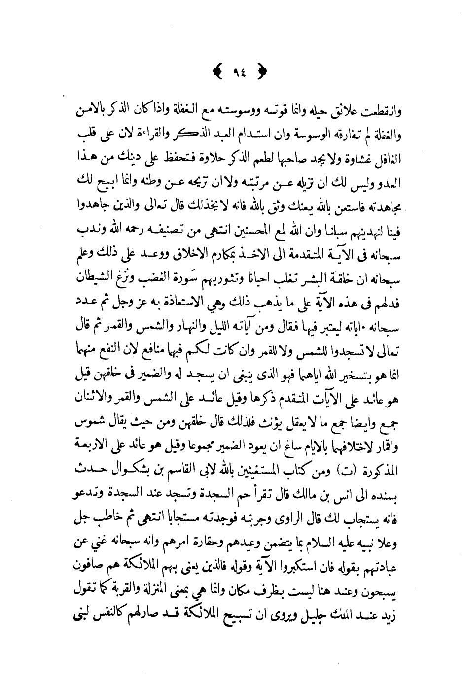 وانقطعت علاق حيله وانما قوته ووسوسته مع الغفلة واذا كان الذكر بالأمن والغفلة لم تفارقه الوسوسة وان استدام العبد الذكر والقراءة لأن على قلب الغافل غشاوة ولا يجد صاحبها لطعم الذكر حلاوة فتحفظ على دينك من هذا العدو وليس لك أن تزيله عن مرتبته ولا أن تزيحه عن وطنه وإنما أبيح لك مجاهدته فاستعن بالله يعنك وثق بالله فانه لا يخذلك قال تعالى والذين جاهدوا فينا لنهدينهم سبلنا وان الله لمع المحسنين انتهى من تصنيفه رحمه الله وندب سبحانه في الآية المتقدمة الى الأخذ بمكارم الأخلاق ووعد على ذلك وعلم سبحانه أن خلقة البشر تغلب أحيانا وتثور بهم سورة الغضب ونزغ الشيطان فدلهم في هذه الآية على ما يذهب ذلك وهي الاستعاذة به عز و جل ثم عدد سبحانه آياته ليعتبر فيها فقال ومن آياته الليل والنهار والشمس والقمر ثم قال تعالى لا تسجدوا للشمس ولا للقمر وان كانت لكم فيهما منافع لأن النفع منهما انما هو يتسخير الله اياهما فهو الذي ينبغي أن يسجد له والضمير في خلقهن قيل هو عائد على الآيات المتقدم ذكرها وقيل عائد على الشمس والقمر والاثنان جمع وايضا جمع ما لا يعقل يؤنث فلذلك قال خلقهن ومن حيث يقال شموس وأقمار لاختلافهما بالأيام ساغ أن يعود الضمير مجموعا وقيل هو عائد على الأربعة المذكورة ت ومن كتاب المستغيثين بالله لأبي القاسم بن بشكوال حدث بسنده الى أنس بن مالك قال تقرأ حم السجدة وتسجد عند السجدة وتدعو فانه يستجاب لك قال الراوي وجربته فوجدته مستجابا انتهى ثم خاطب جل وعلا نبيه عليه السلام بما يتضمن وعيدهم وحقارة أمرهم وأنه سبحانه غني عن عبادتهم بقوله فان استكبروا الآية وقوله فالذين يعني بهم الملائكة هم صافون يسبحون وعند هنا ليست بظرف مكان وانما هي بمعنى المنزلة والقربة كما تقول زيد عند الملك جليل ويروى أن تسبيح الملائكة قد صار لهم كالنفس لبني