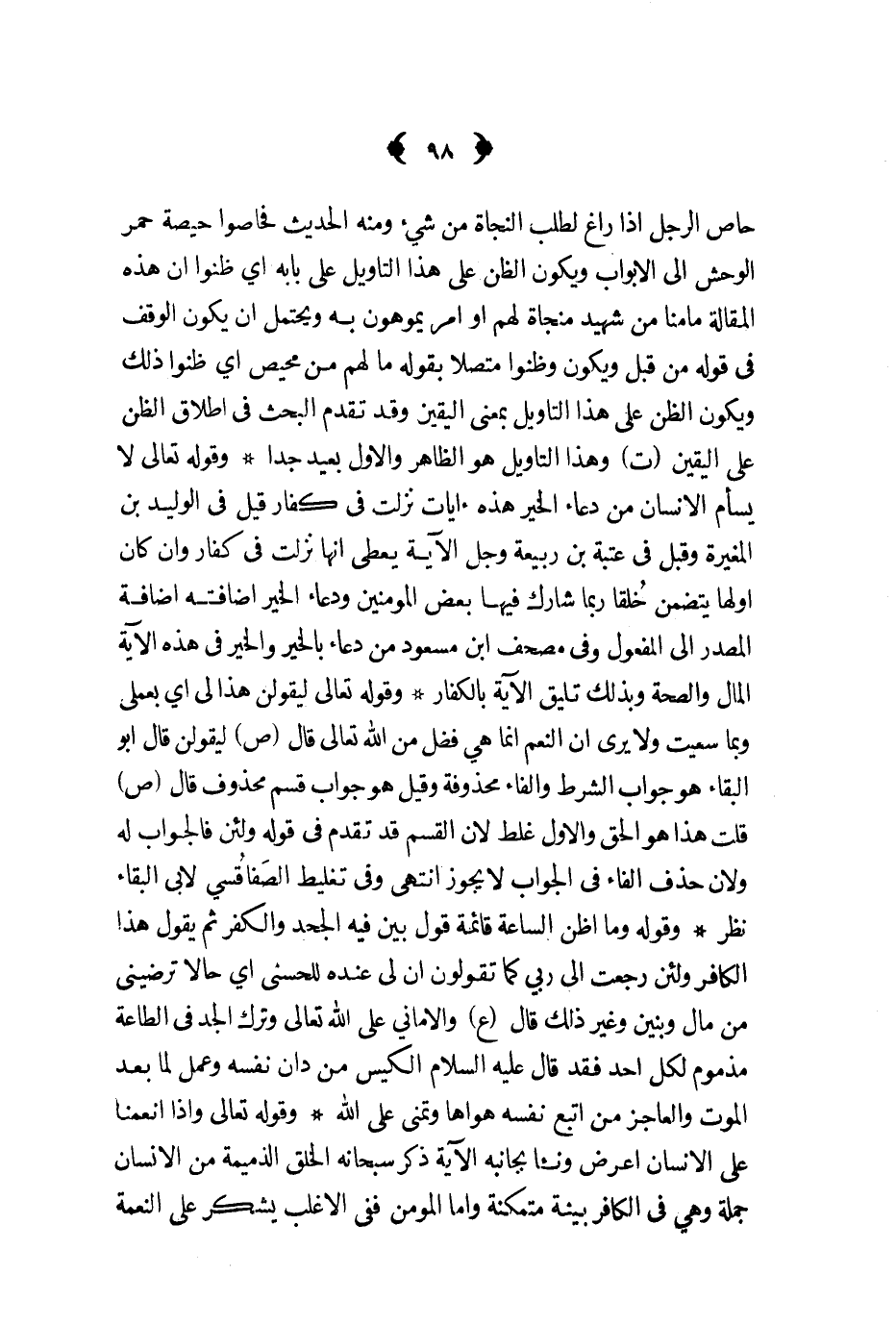 حاص الرجل اذا راغ لطلب النجاة من شيء ومنه الحديث فحاصوا حيصة حمر الوحش الى الأبواب ويكون الظن على هذا التأويل على بابه أي ظنوا أن هذه المقالة ما منا من شهيد منجاة لهم أو أمر يموهون به ويحتمل أن يكون الوقف في قوله من قبل ويكون وظنوا متصلا بقوله ما له من محيص أي ظنوا ذلك ويكون الظن على هذا التأويل بمعنى اليقين وقد تقدم البحث في اطلاق الظن على اليقين ت وهذا التأويل هو الظاهر والأول بعيد جدا وقوله تعالى لا يسأم الانسان من دعاء الخير هذه آيات نزلت في كفار قيل في الوليد بن المغيرة وقيل في عتبة بن ربيعة وجل الآية يعطي أنها نزلت في كفار وإن كان أولها يتضمن خلقا ربما شارك فيها بعض المؤمنين ودعاء الخير اضافته اضافة المصدر الى المفعول وفي مصحف ابن مسعود من دعاء بالخير والخير في هذه الآية المال والصحة وبذلك تليق الآية بالكفار وقوله تعالى ليقولون هذا لي أي بعملي وبما سعيت ولا يرى أن النعم انما هي فضل من الله تعالى قال صلى الله عليه و سلم ليقولون قال أبو البقاء هو جواب الشرط والفاء محذوفة وقيل هو جواب قسم محذوف قال صلى الله عليه و سلم قلت هذا هو الحق والأول غلط لأن القسم قد تقدم في قوله ولئن فالجواب له ولأن حذف الفاء في الجواب لا يجوز انتهى وفي تغليط الصفاقسي لأبي البقاء نظر وقوله وما أظن الساعة قائمة قول بين فيه الجحد والكفر ثم يقول هذا الكافر ولئن رجعت الى ربي كما تقولون أن لي عنده للحسنى أي حالا ترضيني من مال وبنين وغير ذلك قال ع والأماني على الله تعالى وترك الجد في الطاعة مذموم لكل أحد فقد قال عليه السلام الكيس من دان نفسه وعمل لما بعد الموت والعاجز من اتبع نفسه هواها وتمنى على الله وقوله تعالى واذا أنعمنا على الانسان أعرض ونئا عن جانبه الآية ذكر سبحانه الخلق الذميمة من الانسان جملة وهي في الكافر بينة متمكنة وأما المؤمن ففي الأغلب يشكر على النعمة