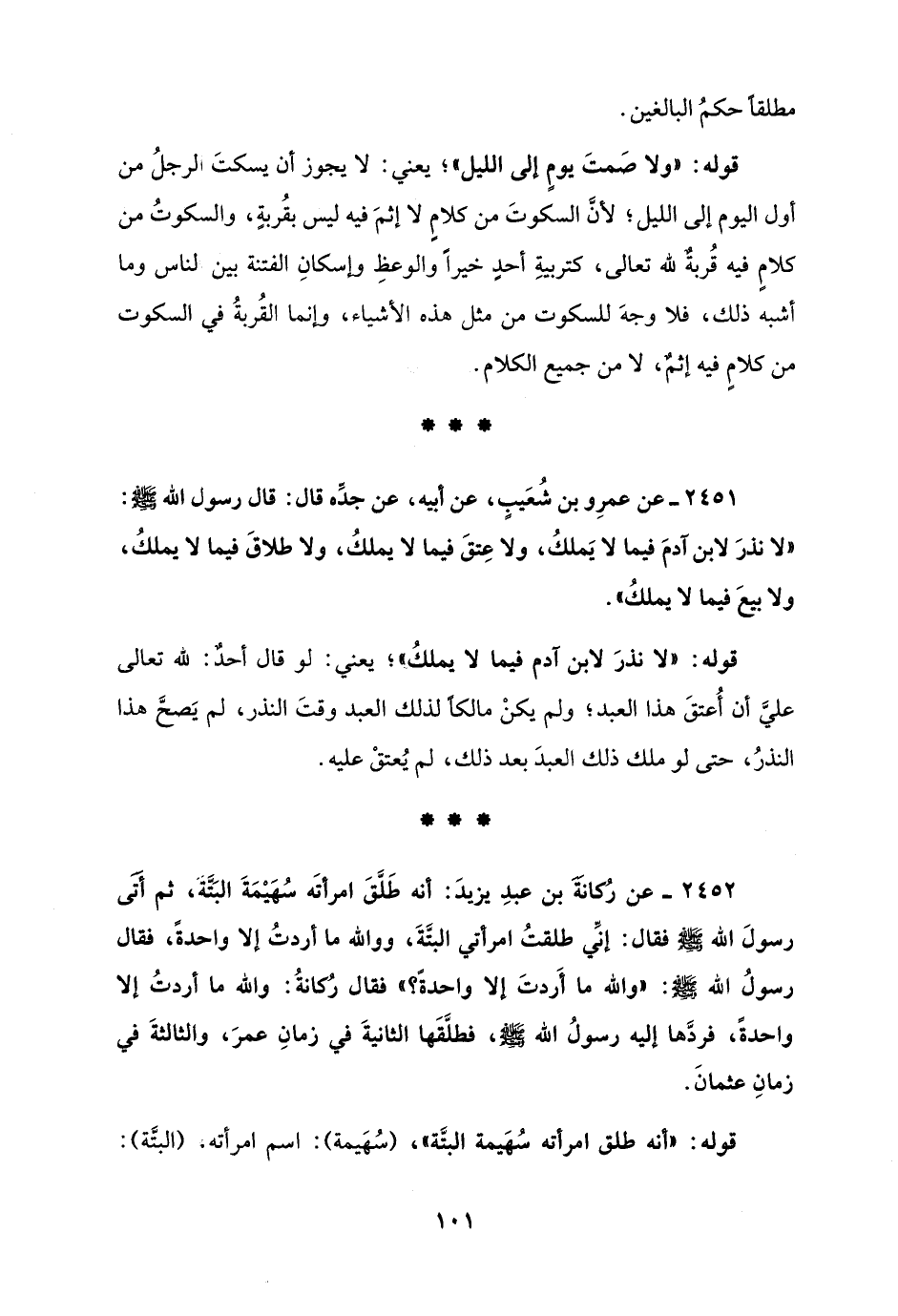2451 - عن عمرِو بن شُعَيبٍ، عن أبيه، عن جدِّه قال: قال رسول الله - صلى الله عليه وسلم -: "لا نذرَ لابن آدمَ فيما لا يَملكُ، ولا عِتقَ فيما لا يملكُ، ولا طلاقَ فيما لا يملكُ، ولا بيعَ فيما لا يملكُ".