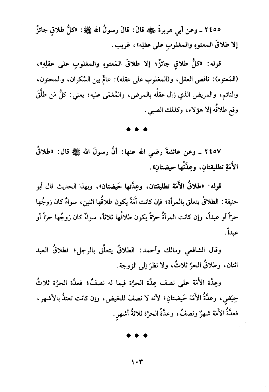 2457 - وعن عائشةَ رضي الله عنها: أنَّ رسولَ الله - صلى الله عليه وسلم - قال: "طلاقُ الأَمَةِ تطليقتانِ، وعِدَّتُها حيضتانِ".