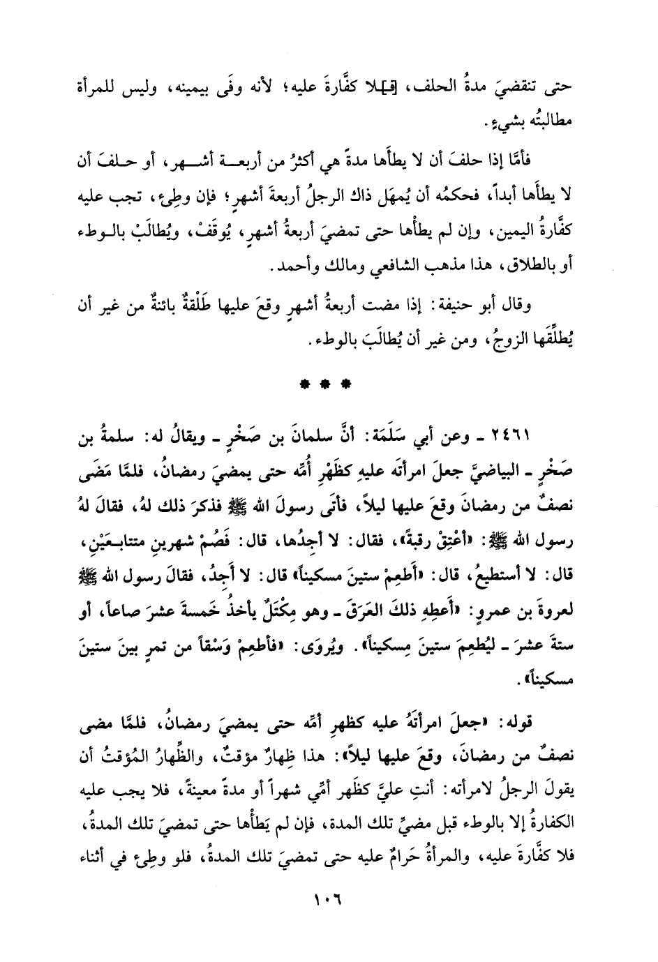 2461 - وعن أبي سَلَمَة: أنَّ سلمانَ بن صَخْرٍ - ويقالُ له: سلمةُ بن صَخْرٍ - البياضيَّ جعلَ امرأتَه عليهِ كظَهْرِ أُمِّه حتَّى يمضيَ رمضانُ، فلمَّا مَضَى نصفٌ من رمضانَ وقعَ عليها ليلًا، فأتَى رسولَ الله - صلى الله عليه وسلم - فذكرَ ذلك لهُ، فقالَ لهُ رسول الله - صلى الله عليه وسلم -: "أعْتِقْ رقبةً"، فقال: لا أجِدُها، قال: فَصُمْ شهرينِ متتابعَيْنِ، قال: لا أستطيعُ، قال: "أَطعِمْ ستينَ مسكينًا" قال: لا أَجِدُ، فقالَ رسول الله - صلى الله عليه وسلم - لعروةَ بن عمروٍ: "أَعطِهِ ذلكَ العَرَقَ - وهو مِكْتَلٌ يأخذُ خَمسةَ عشرَ صاعًا، أو ستةَ عشرَ - ليُطعِمَ ستينَ مِسكينًا". ويُروَى: "فأطعِمْ وَسْقًا من تمرٍ بينَ ستينَ مسكينًا".
