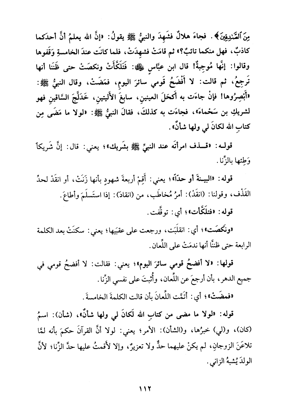 مِنَ الصَّادِقِينَ}. فجاءَ هلالٌ فشَهِدَ والنبيُّ - صلى الله عليه وسلم - يقولُ: "إنَّ الله يعلمُ أنَّ أحدَكما كاذبٌ، فهل منكما تائبٌ؟ "، ثم قامَتْ فشهِدَتْ، فلما كانَت عندَ الخامسةِ وَقَفوها وقالوا: إنَّها مُوجِبةٌ! قال ابن عبَّاسٍ - رضي الله عنهما -: فتَلَكَّأَتْ ونكصَتْ حتَّى ظَنَنا أنها تَرجِعُ، ثم قالت: لا أَفْضَحُ قَومي سائرَ اليومِ، فمَضَتْ، وقال النبيُّ - صلى الله عليه وسلم -: "أَبْصِرُوها! فإنْ جاءَت به أَكَحَلَ العينينِ، سابغَ الأَليتينِ، خَدَلَّجَ السَّاقينِ فهو لشريكِ بن سَحْماءَ"، فجاءَت به كذلكَ، فقالَ النبيُّ - صلى الله عليه وسلم -: "لولا ما مَضَى مِن كتابِ الله لكانَ لي ولها شأنٌ".