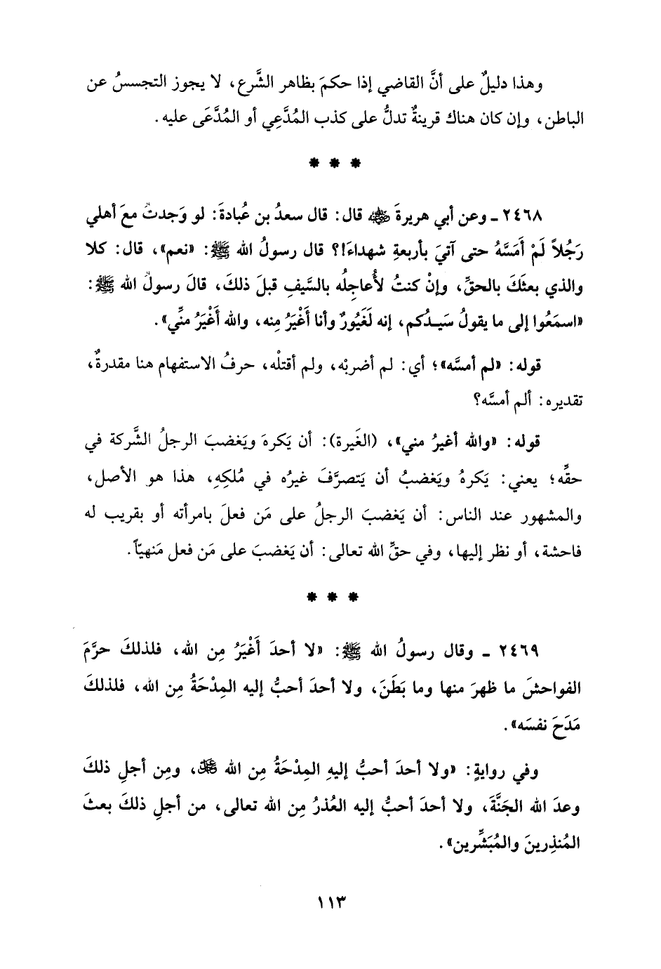 2468 - وعن أبي هريرةَ - رضي الله عنه - قال: قال سعدُ بن عُبادةَ: لو وَجدتُ معَ أهلي رَجُلًا لَمْ أَمَسَّهُ حتَّى آتيَ باربعةِ شهداءَ!؟ قال رسولُ الله - صلى الله عليه وسلم -: "نعم"، قال: كلا والذي بعثَكَ بالحقِّ، دمانْ كُنْتُ لأُعَاجِلُه بالسَّيفِ قبلَ ذلكَ، قالَ رسولُ الله - صلى الله عليه وسلم -: "اسمَعُوا إلى ما يقولُ سَيدُكم، إنه لَغَيُورٌ وأنا أَغْيَرُ مِنه، والله أَغْيَرُ منِّي".