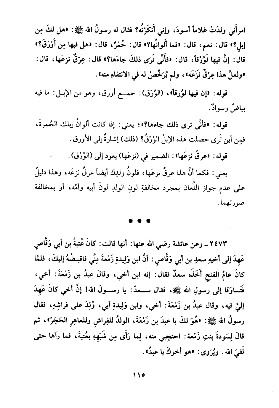 2473 - وعن عائشة رضي الله عنها: أنها قالت: كَانَ عُتبةُ بن أبي وَقَّاصٍ عَهِدَ إلى أخيهِ سعدِ بن أبي وَقَّاصٍ: أنَّ ابن وَلِيدةِ زَمْعةَ مِنِّي فاقبضْهُ إليكَ، فلمَّا كانَ عامُ الفتح أَخَذَه سعدٌ فقال: إنه ابن أخي، وقالَ عبدُ بن زَمْعْةَ: أخي، فَتَساوَقا إلى رسولِ الله - صلى الله عليه وسلم -، فقال سعدٌ: يا رسولَ الله! إنَّ أخي كانَ عَهِدَ إليَّ فيه، وقال عبدُ بن زَمْعَةَ: أخي، وابن وَلِيدةِ أبي، وُلِدَ على فراشِهِ، فقال رسولُ الله - صلى الله عليه وسلم -: "هُوَ لكَ يا عبدَ بن زَمْعَةَ، الولدُ للفِراشِ وللعاهِرِ الحَجَرُ"، ثم قالَ لِسَودةَ بنتِ زَمْعة: احتجِبي منه، لِما رَأَى مِن شَبَهِهِ بعُتبةَ، فما رآها حتى لَقيَ الله. ويُروى: "هو أخوكَ يا عبدُ".