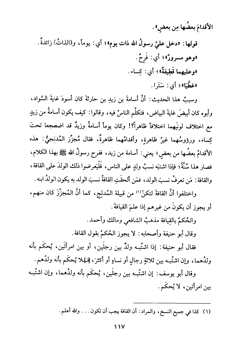 وسببُ هذا الحديث: أنَّ أسامةَ بن زيدِ بن حارثةَ كان أسودَ غايةَ السَّواد، وأبوه كان أبيضَ غايةَ البياض، فتكلَّم الناسُ فيه، وقالوا: كيف يكون أسامةُ من زيدٍ مع اختلاف لونَيهما اختلافًا ظاهرًا؟! وكان يومًا أسامةُ وزيدٌ قد اضطجعا تحتَ كِساء، ورؤوسُهما غيرُ ظاهرةٍ، وأقدامُهما ظاهرةٌ، فقال مُجزِّز المُدلِجيُّ: هذه الأقدامُ بعضُها من بعضٍ؛ يعني: أسامة من زيد، ففرح رسولُ الله - صلى الله عليه وسلم - بهذا الكلام، فصار هذا سُنَّةً؛ فإذا اشتبَه نسبُ ولدٍ على الناس، فَلْيَعرضوا ذلك الولدَ على القافة، والقافة: مَن تعرفُ نسبَ الولد، فمَن ألحقَتِ القافةُ نسبَ الولد به يكون الولدُ ابنه.