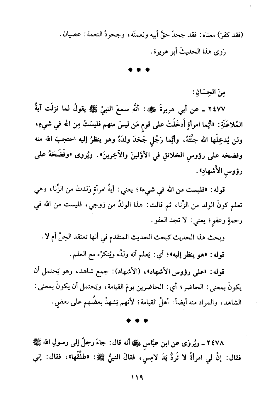 2477 - عن أبي هريرةَ - رضي الله عنه -: أنَّه سمعَ النبيَّ - صلى الله عليه وسلم - يقولُ لما نزلَت آيةُ المُلاعَنَةِ: "أيُّما امرأةٍ أَدخَلَتْ على قومٍ مَن ليسَ منهم فليسَتْ مِن الله في شيءٍ، ولن يُدخِلَها الله جنَّتَهُ، وأيُّما رَجُلٍ جَحَدَ ولدَهُ وهو ينظرُ إليه احتجبَ الله منه وفضحَه على رؤوسِ الخلائقِ في الأوَّلينَ والآخِرينَ". ويُروى "وفَضَحَهُ على رؤوسِ الأَشهادِ".