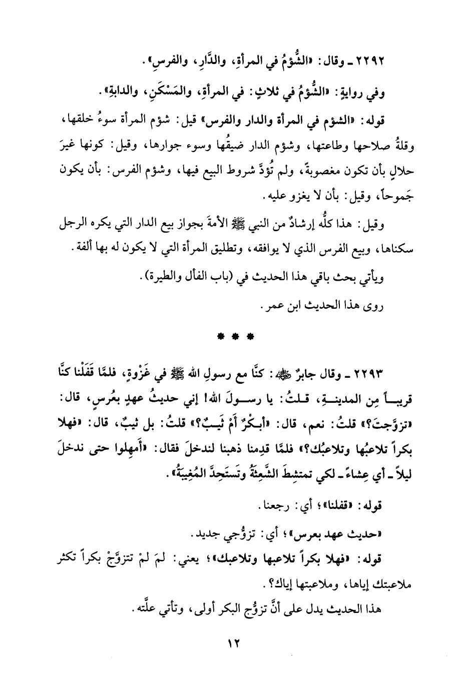 2293 - وقال جابرٌ - رضي الله عنه -: كنَّا مع رسولِ الله - صلى الله عليه وسلم - في غَزْوةٍ، فلمَّا قَفَلْنا كنَّا قريبًا مِن المدينةِ، قلتُ: يا رسولَ الله! إني حديثُ عهدٍ بعُرسٍ، قال: "تزوَّجتَ؟ " قلتُ: نعم، قال: "أبكْرٌ أَمْ ثَيبٌ؟ " قلتُ: بل ثيبٌ، قالَّ: "فهلا بكرًا تلاعبُها وتلاعبُك؟ " فلمَّا قدِمنا ذهبنا لندخلَ فقال: "أَمهِلوا حتى ندخلَ ليلًا - أي عِشاءً - لكي تمتشِطَ الشَّعِثَةُ وتَستَحِدَّ المُغِيبَةُ".