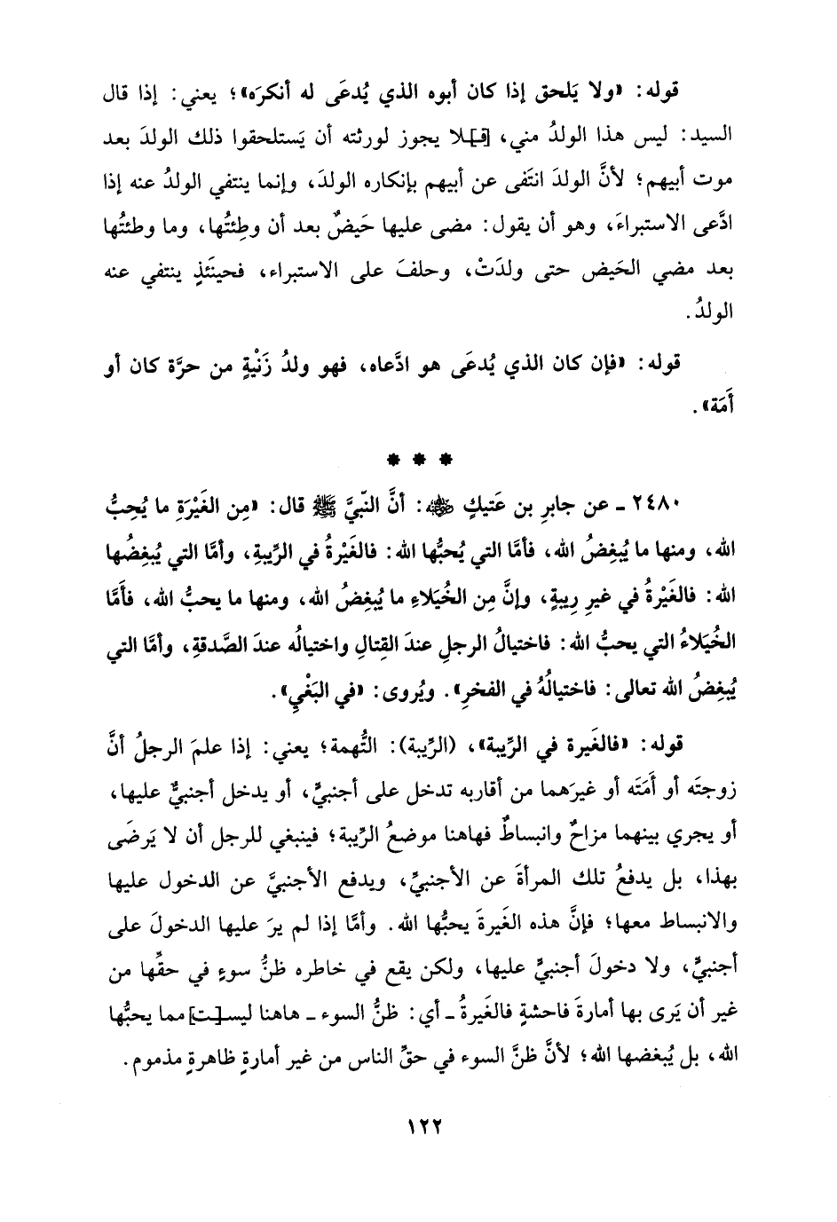 2480 - عن جابرِ بن عَتيكٍ - رضي الله عنه -: أنَّ النّبيَّ - صلى الله عليه وسلم - قال: "مِن الغَيْرَةِ ما يُحِبُّ الله، ومنها ما يُبْغِضُ الله، فأمَّا التي يُحبُّها الله: فالغَيْرةُ في الرِّيبةِ، وأمَّا التي يُبغِضُها الله: فالغَيْرةُ في غيرِ رِيبةٍ، وإنَّ مِن الخُيَلاءِ ما يُبْغِضُ الله، ومنها ما يحبُّ الله، فأمَّا الخُيَلاءُ التي يحبُّ الله: فاختيالُ الرجلِ عندَ القِتالِ واختيالُه عندَ الصَّدقةِ، وأمَّا التي يُبْغِضُ الله تعالى: فاختيالُهُ في الفخرِ". ويُروى: "في البَغْيِ".