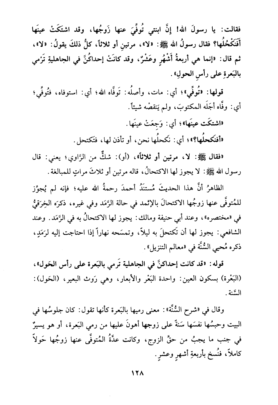 فقالت: يا رسولَ الله! إِنَّ ابنتي تُوفِّيَ عنها زَوجُها، وقد اشتَكَتْ عينَها أَفَنَكْحُلُها؟ فقال رسولُ الله - صلى الله عليه وسلم -: "لا"، مرتينِ أو ثلاثًا، كلُّ ذلكَ يقولُ: "لا"، ثم قال: "إنما هي أربعةُ أَشْهُرٍ وعَشْرٌ، وقد كانَتْ إحداكُنَّ في الجاهليةِ تَرْمي بالبَعرةِ على رأسِ الحولِ".