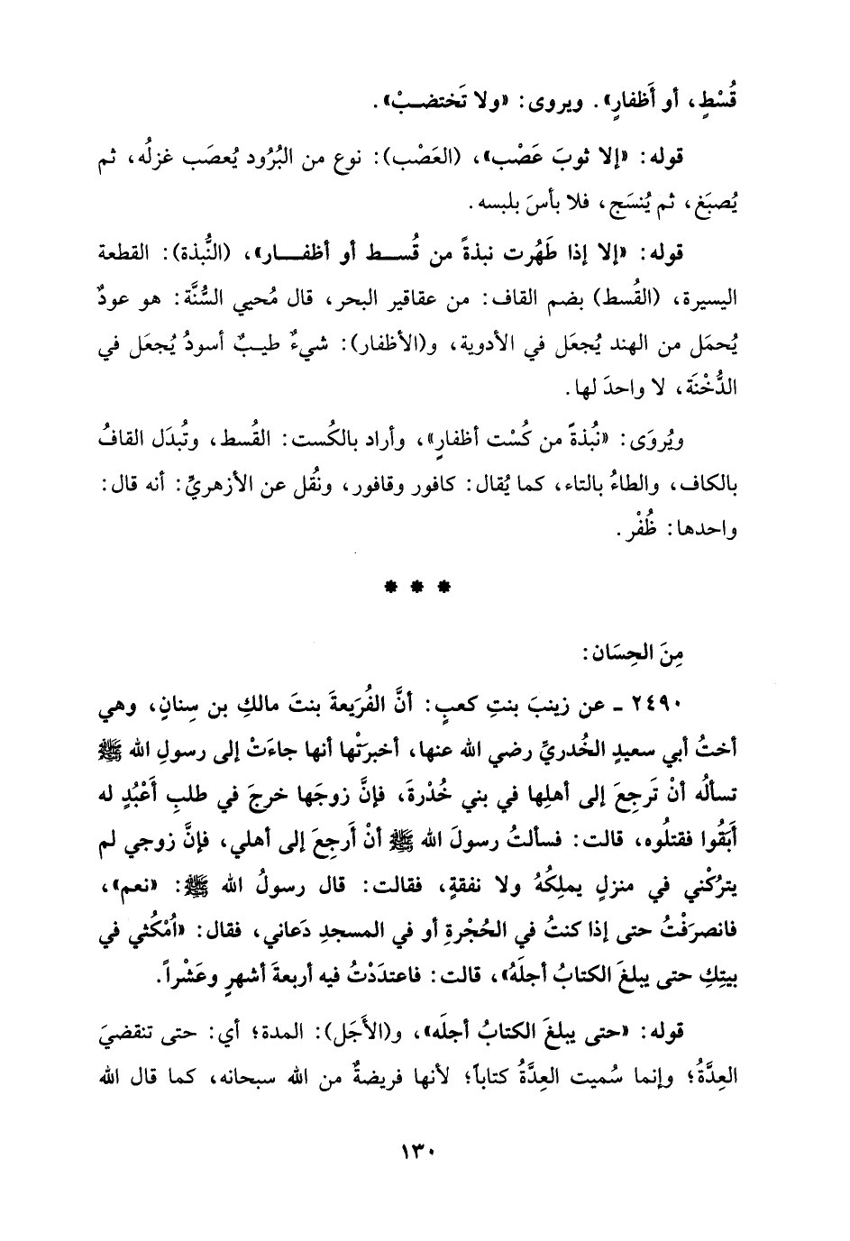 2490 - عن زينبَ بنتِ كعبٍ: أنَّ الفُرَيعةَ بنتَ مالكِ بن سِنانٍ، وهي أختُ أبي سعيدٍ الخُدريِّ رضي الله عنها، أخبرَتْها أنها جاءَتْ إلى رسولِ الله - صلى الله عليه وسلم - تسألُه أنْ تَرجِعَ إلى أهلِها في بني خُدْرةَ، فإنَّ زوجَها خرجَ في طلبِ أَعْبُدٍ له أَبَقُوا فقتلُوه، قالت: فسألتُ رسولَ الله - صلى الله عليه وسلم - أنْ أَرجِعَ إلى أهلي، فإنَّ زوجي لم يترُكْني في منزلٍ يملِكُهُ ولا نفقةٍ، فقالت: قال رسولُ الله - صلى الله عليه وسلم -: "نعم"، فانصرَفْتُ حتى إذا كنتُ في الحُجْرةِ أو في المسجدِ دَعاني، فقال: "اُمْكُثي في بيتِكِ حتى يبلغَ الكتابُ أجلَهُ"، قالت: فاعتدَدْتُ فيه أربعةَ أشهرٍ وعَشْرًا.