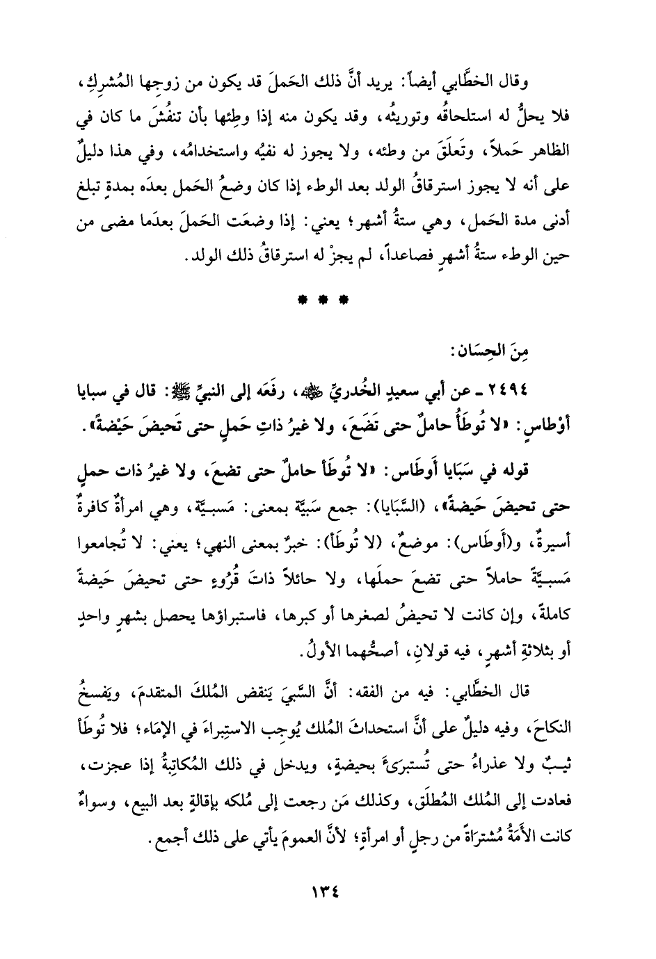 2494 - عن أبي سعيدٍ الخُدريِّ - رضي الله عنه -، رفَعَه إلى النبيِّ - صلى الله عليه وسلم -: قال في سبايا أوْطاسٍ: "لا تُوطَأُ حاملٌ حتى تَضَعَ، ولا غيرُ ذاتِ حَملٍ حتى تَحيضَ حَيْضةً".