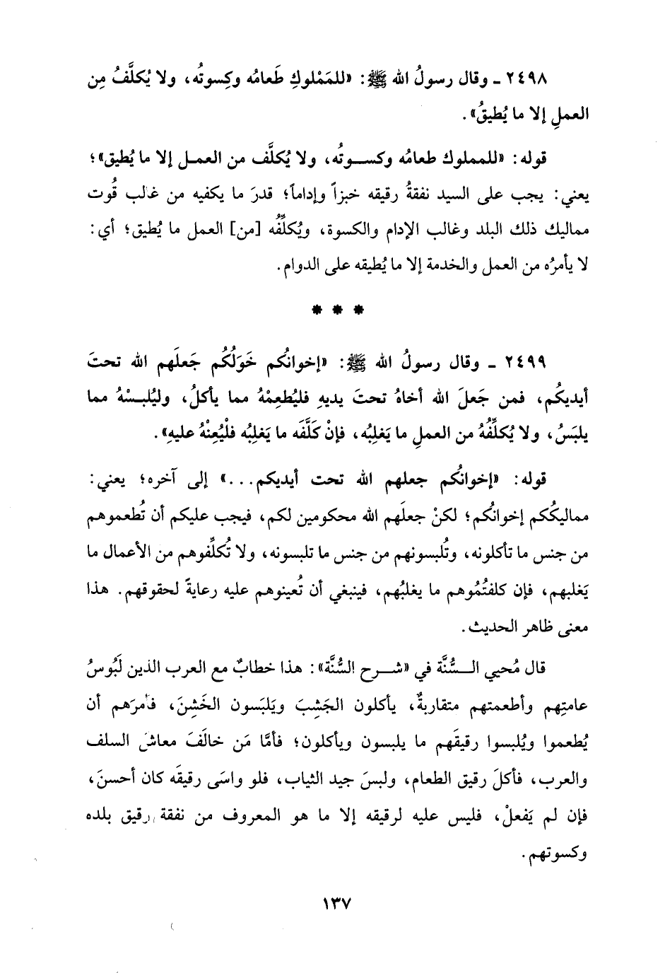 2498 - وقال رسولُ الله - صلى الله عليه وسلم -: "للمَمْلوكِ طَعامُه وكِسوتُه، ولا يُكلَّفُ مِن العملِ إلا ما يُطيقُ".